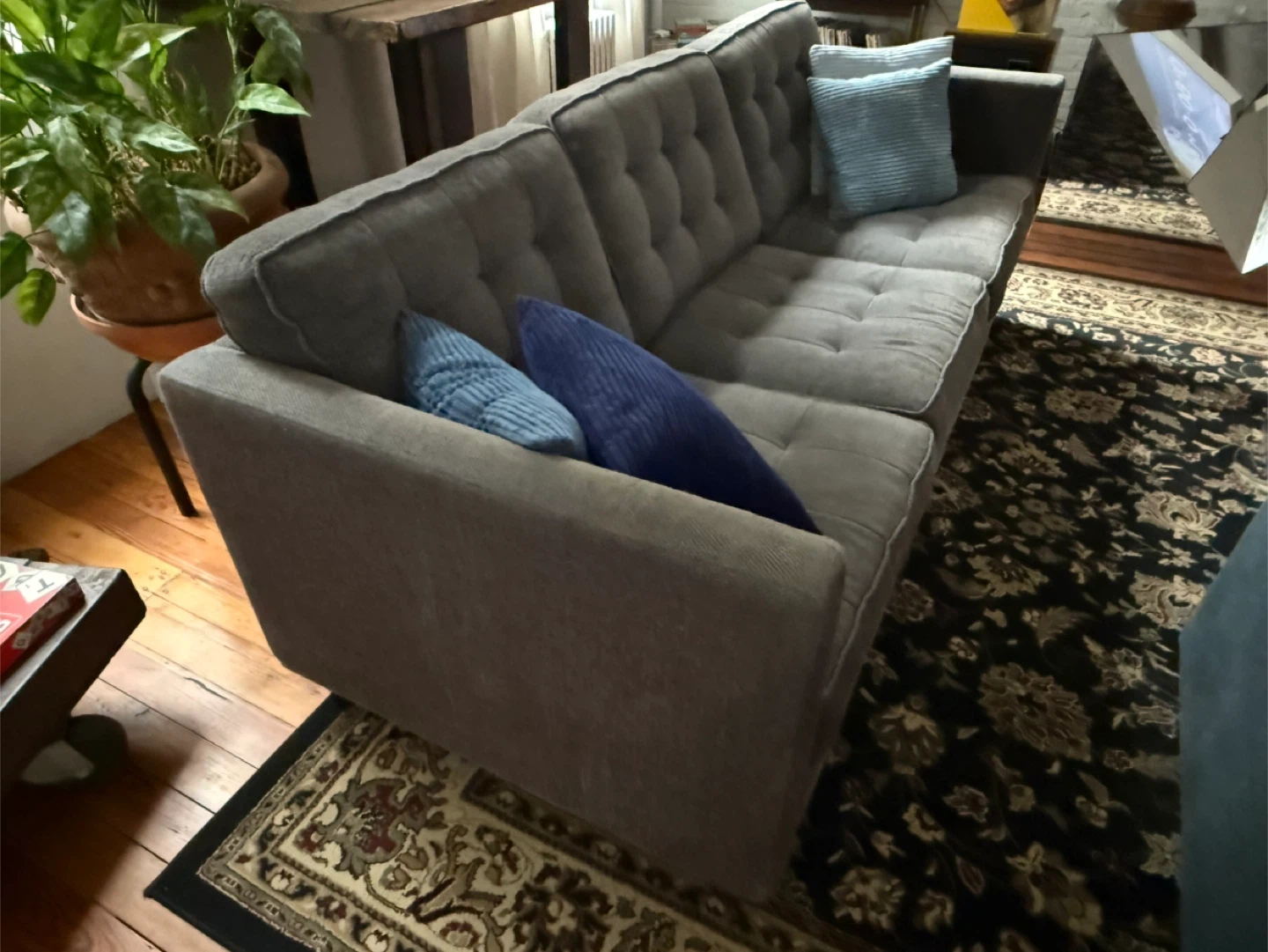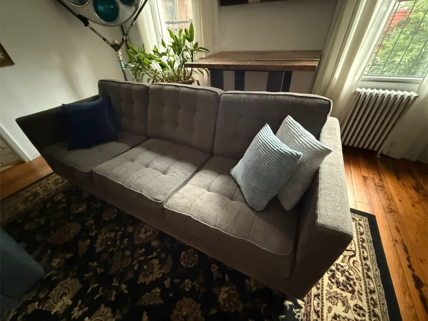 70Selling a comfortable gray sofa that's perfect for any living room! It's in great shape and ready for a new home. The sofa features a stylish, tufted design and is made of a durable material.