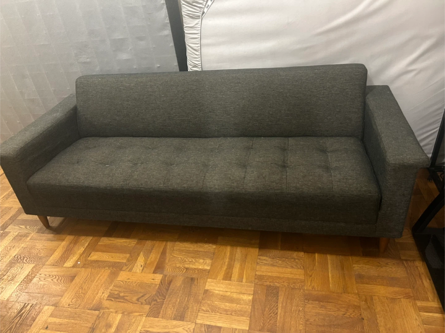 Selling a comfortable gray sofa, perfect for any living room. It's in good condition and ready for a new home