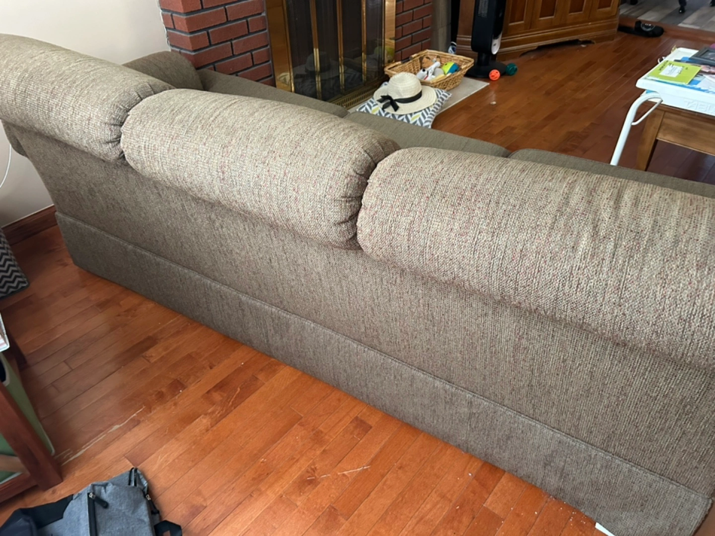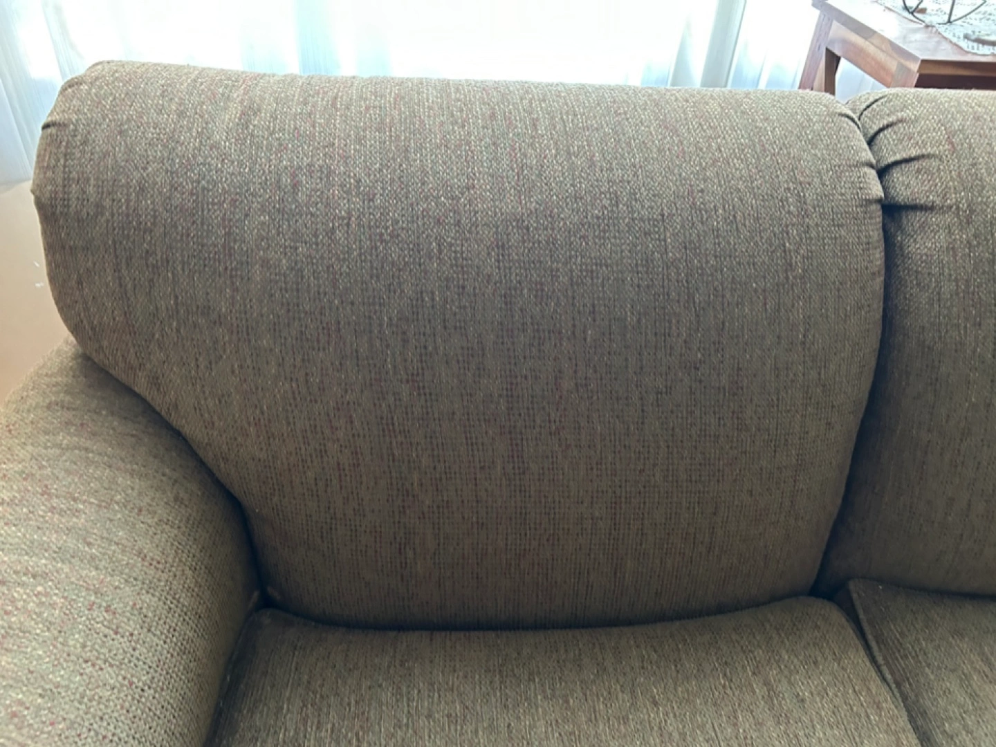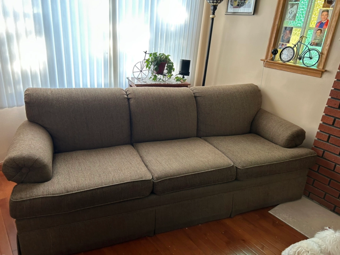 Selling a comfy three-seat sofa! It's in great condition and ready for a new home. Ethan Allen frame with a strong structure/ legs. The color is a neutral, textured brown with burgundy color in it . Pretty, no tears or stains .It's a great size for a living room or den. Let me know if you're interested in taking a look! Worth checking it out !
