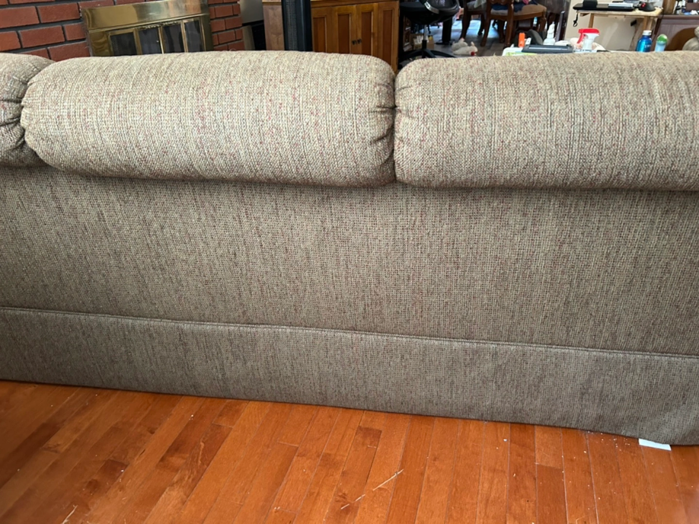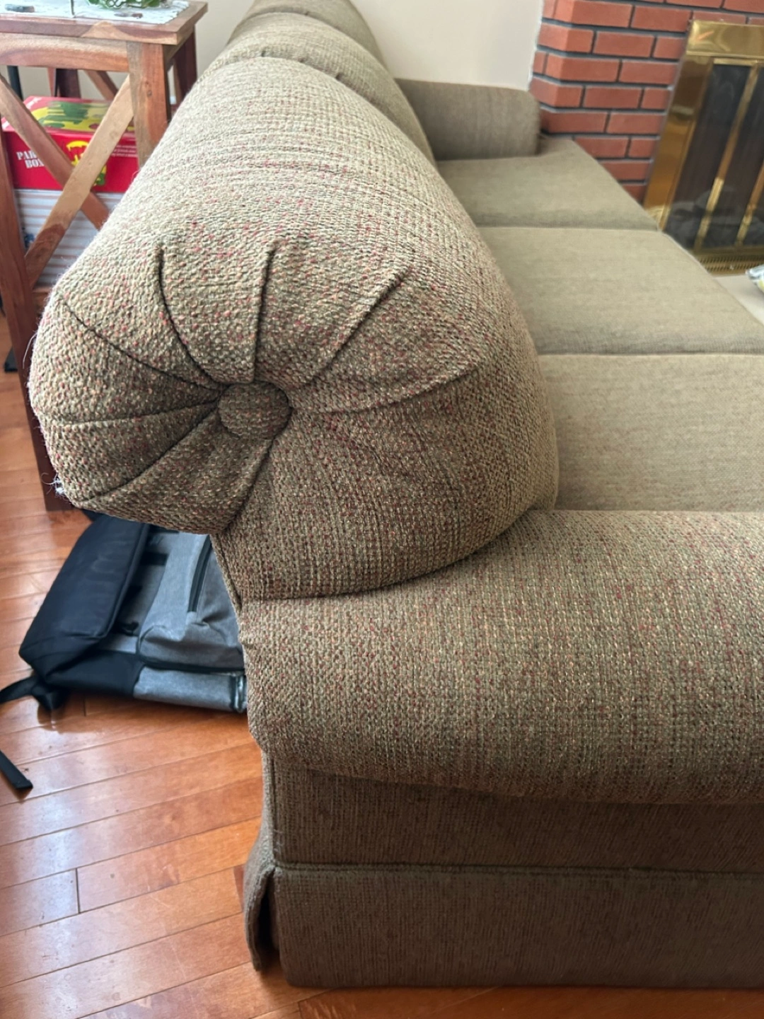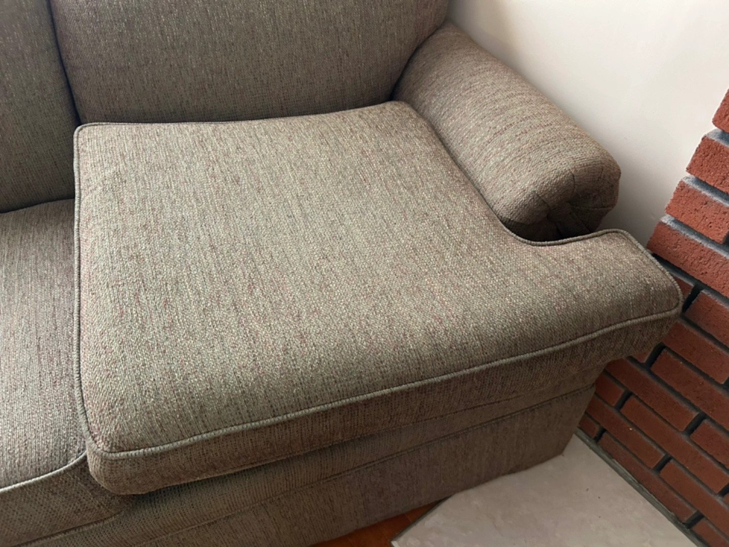 Selling a comfy three-seat sofa! It's in great condition and ready for a new home. Ethan Allen frame with a strong structure/ legs. The color is a neutral, textured brown with burgundy color in it . Pretty, no tears or stains .It's a great size for a living room or den. Let me know if you're interested in taking a look! Worth checking it out !