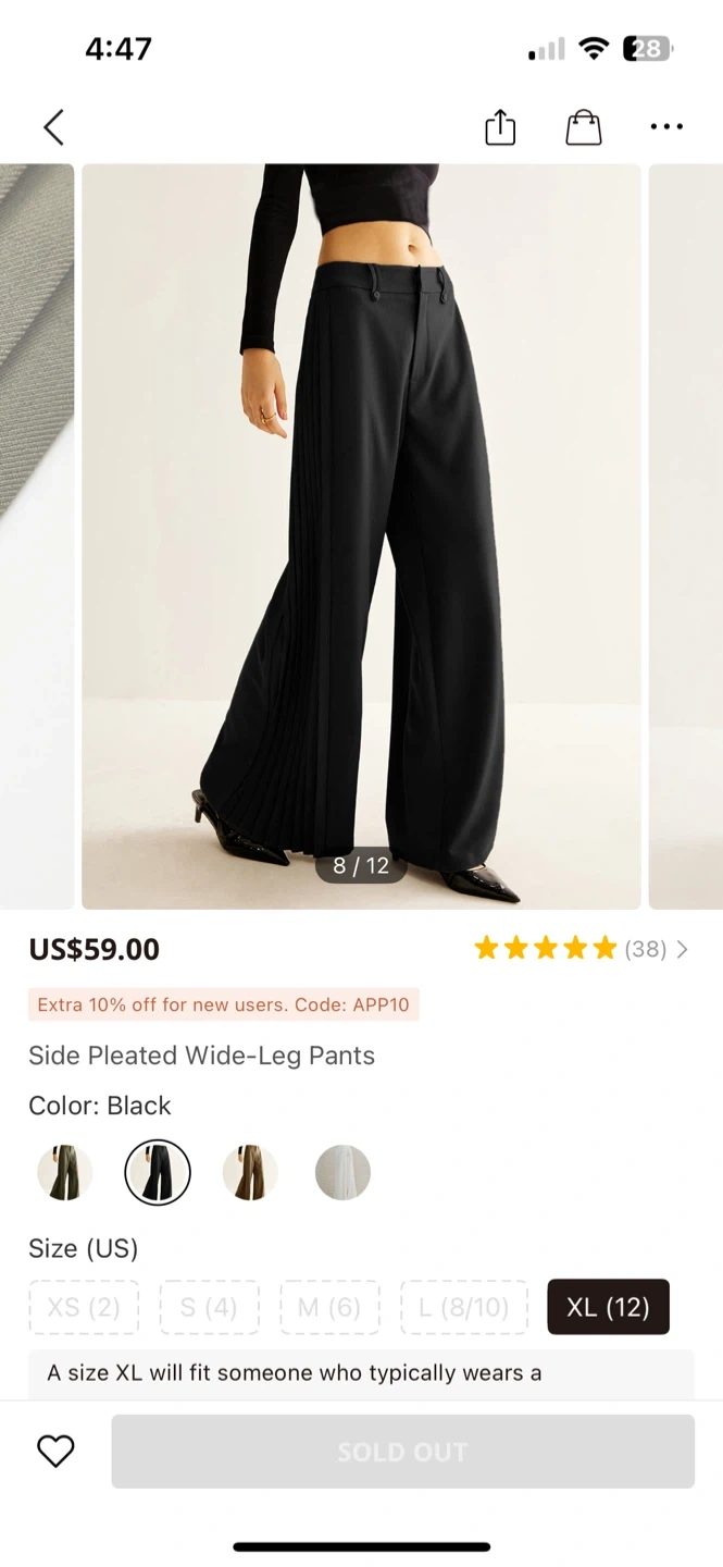 Selling a pair of side pleated wide-leg pants in black, size XL! These pants are super stylish and comfortable.