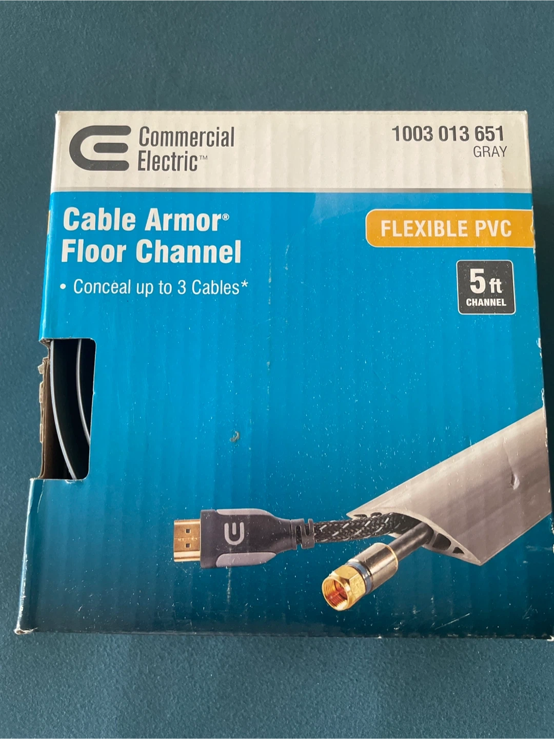 Selling a Commercial Electric Cable Armor Floor Channel. It's a flexible PVC channel in gray, designed to conceal up to 3 cables. The channel is 5ft long.