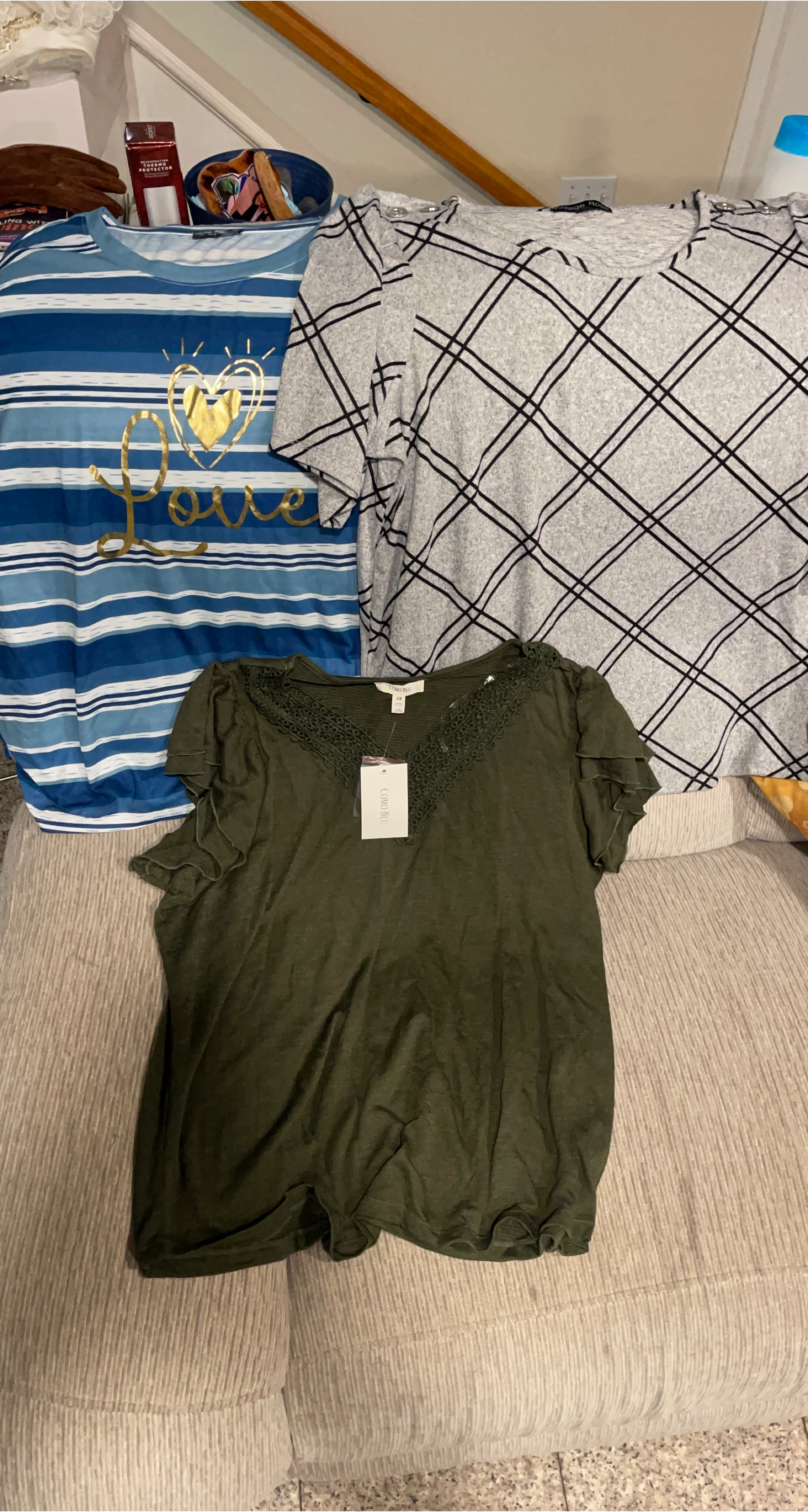 15Selling a Como Blu olive green top in size 2X. It features a V-neck with lace detailing and short sleeves with ruffle accents. Perfect for a casual, comfortable look! And 2 more tops also 2x gray and blue, white and green top.