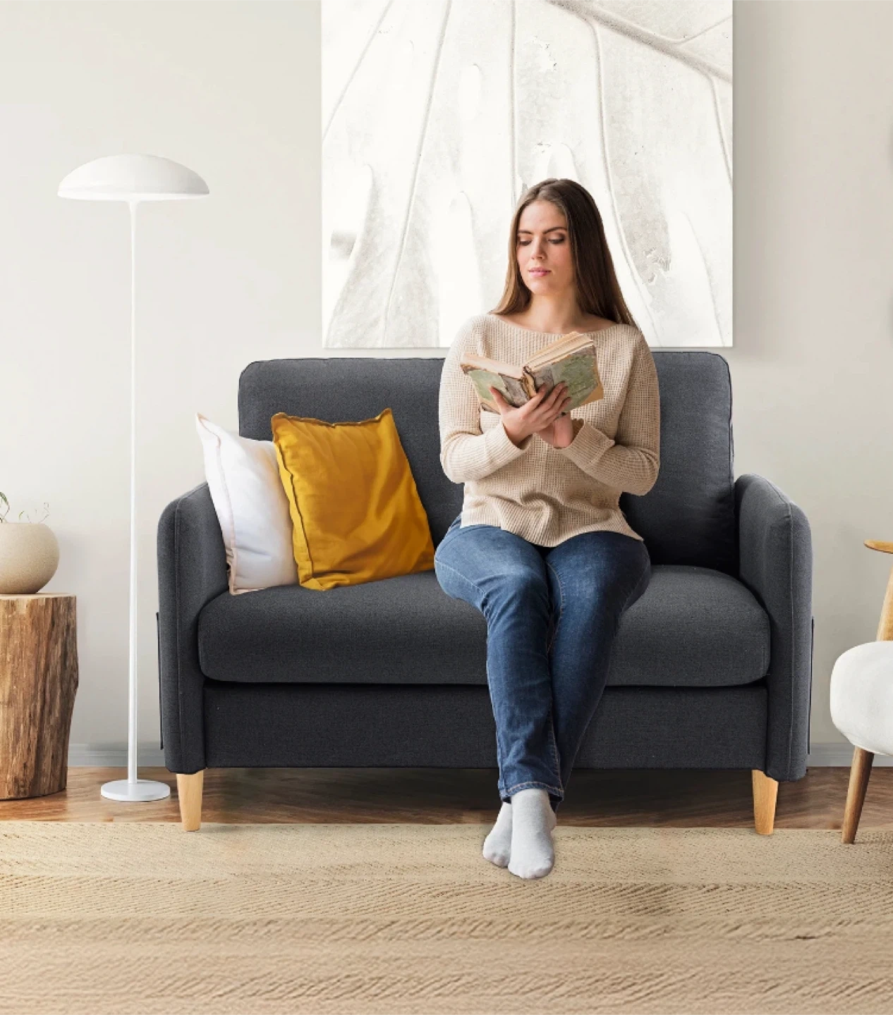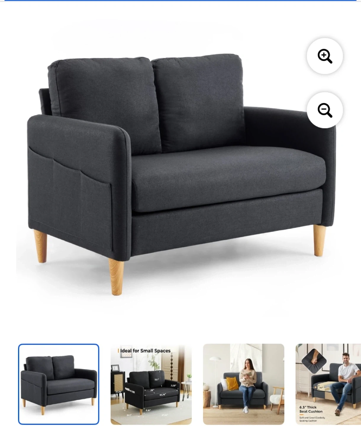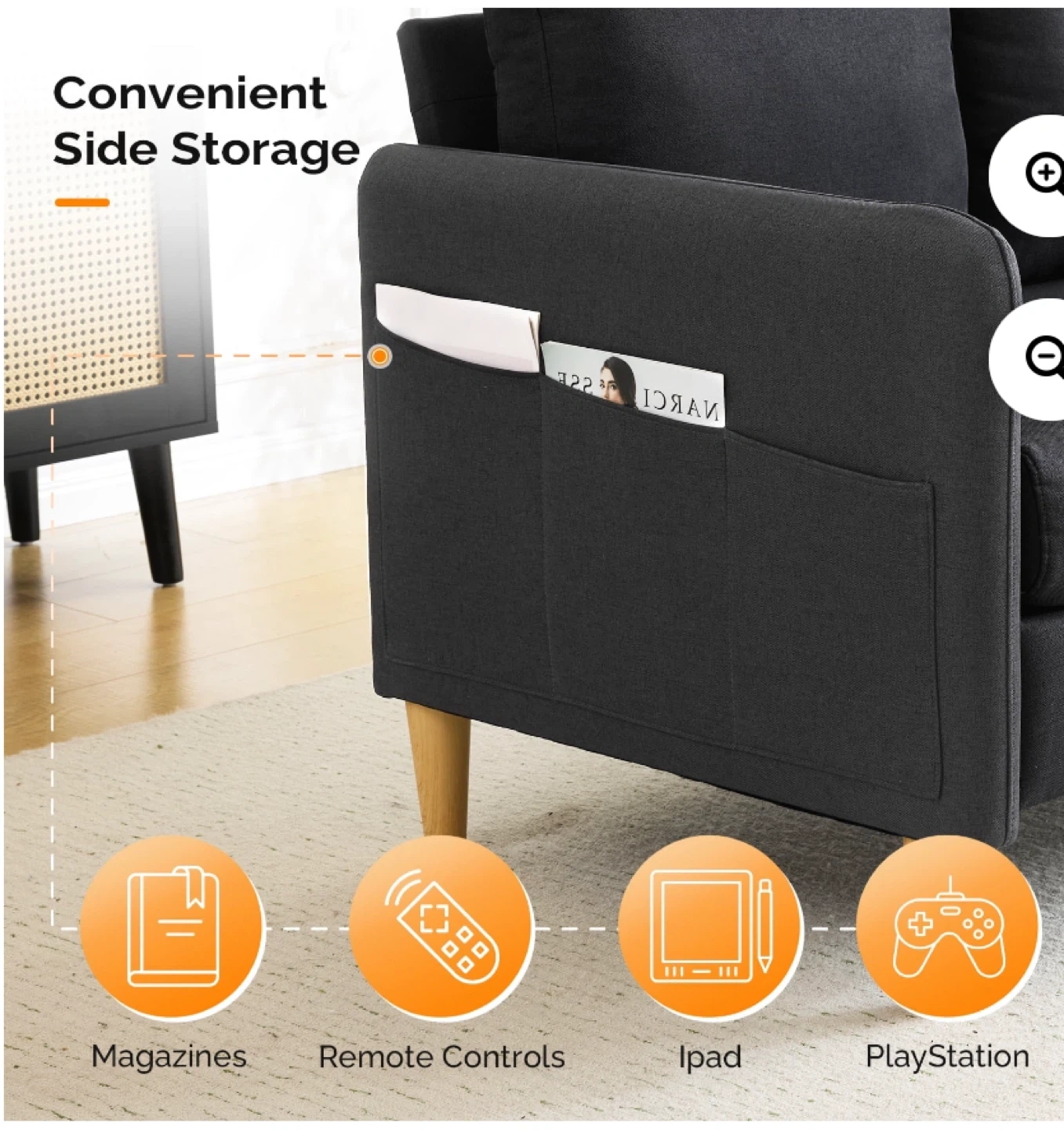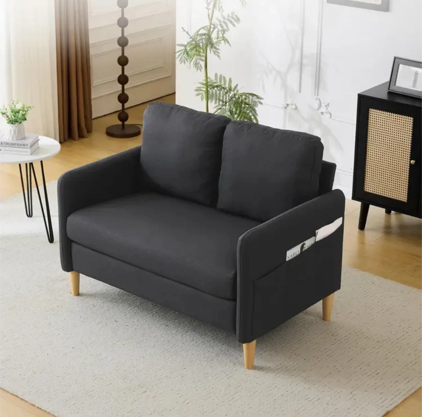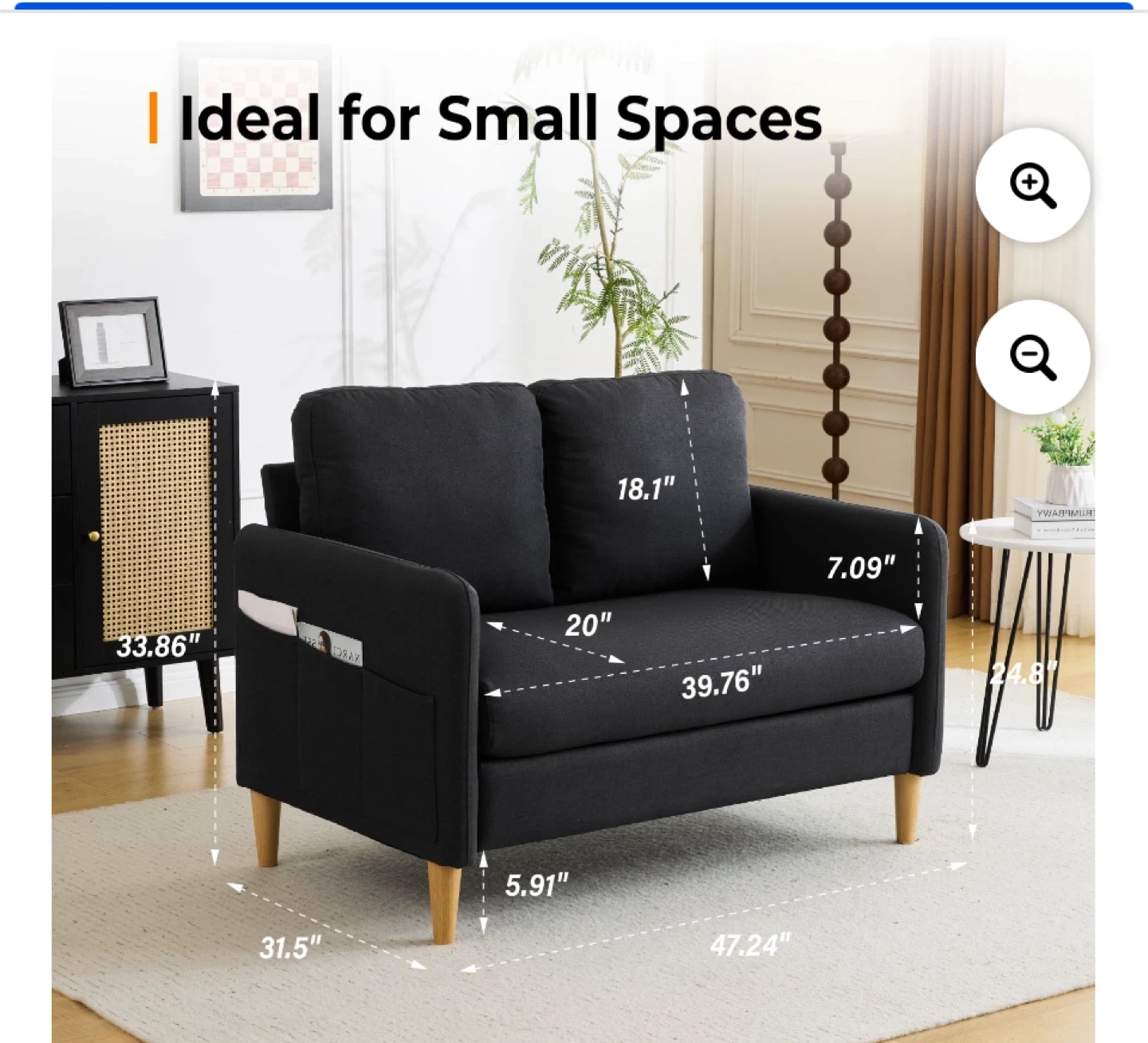 60This compact loveseat sofa is perfect for small spaces! It features convenient side storage for magazines, remote controls, or even an iPad. The seat cushion is 6.3" thick, providing comfortable seating. Dimensions are approximately 47.24" wide, 33.86" high, and 31.5" deep. BRAND NEW BOX NEVER OPENED