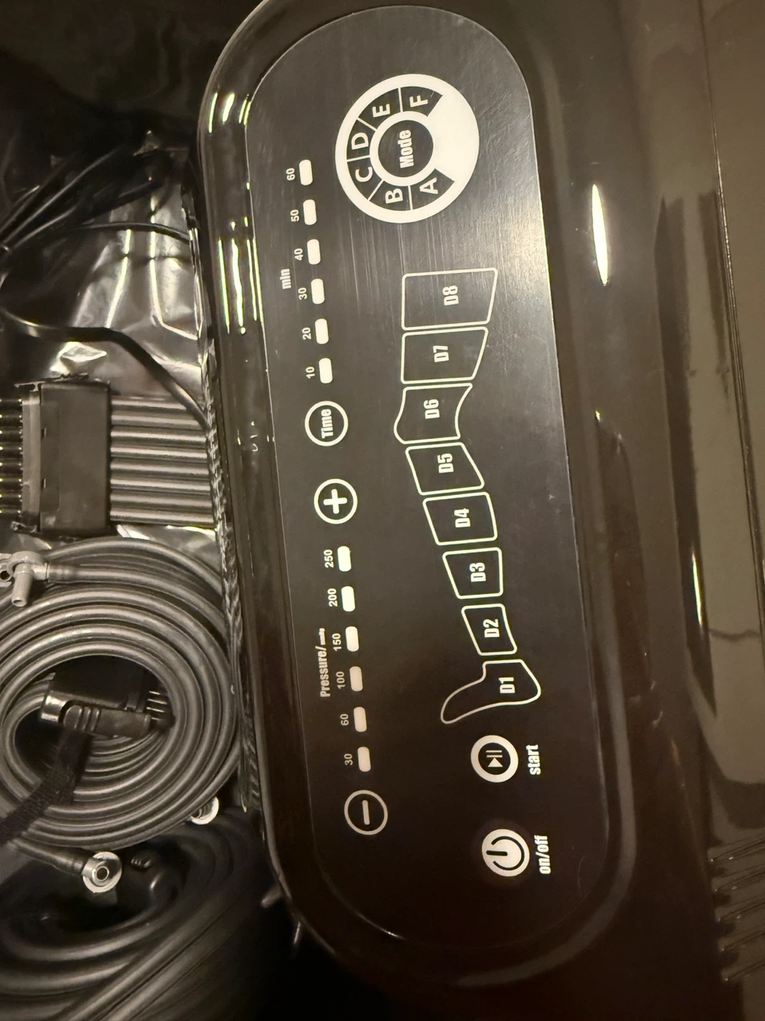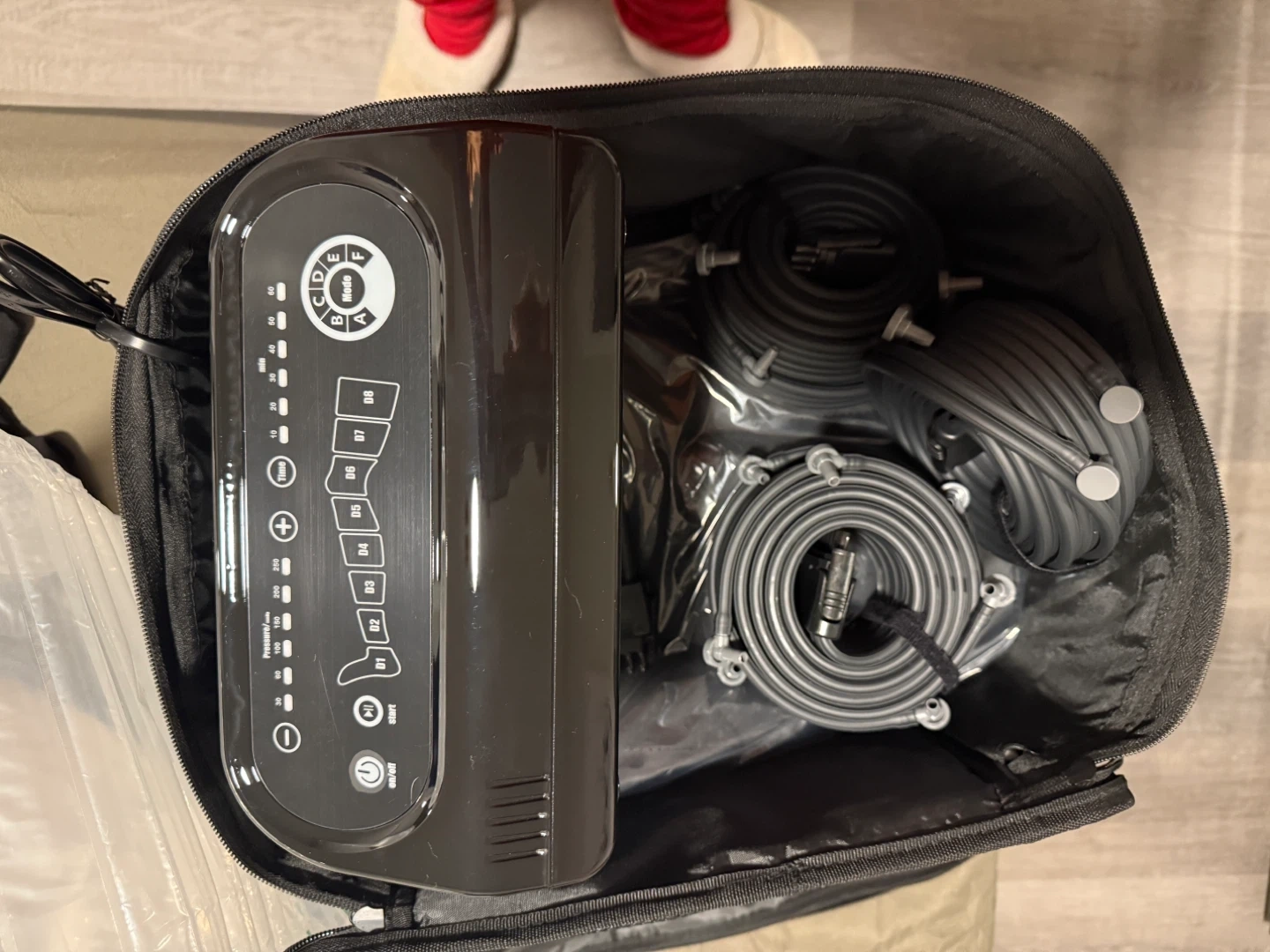 84Northeast Medical Device compression therapy system. It comes with all the components in its original carrying case. The main unit you see in the picture is the control pump, and the coiled tubes connect to inflatable sleeves (usually for legs, arms, or waist). The machine inflates and deflates the sleeves in cycles to improve blood circulation, reduce swelling, relieve muscle fatigue, or assist with lymphatic drainage. This is a brand new machine