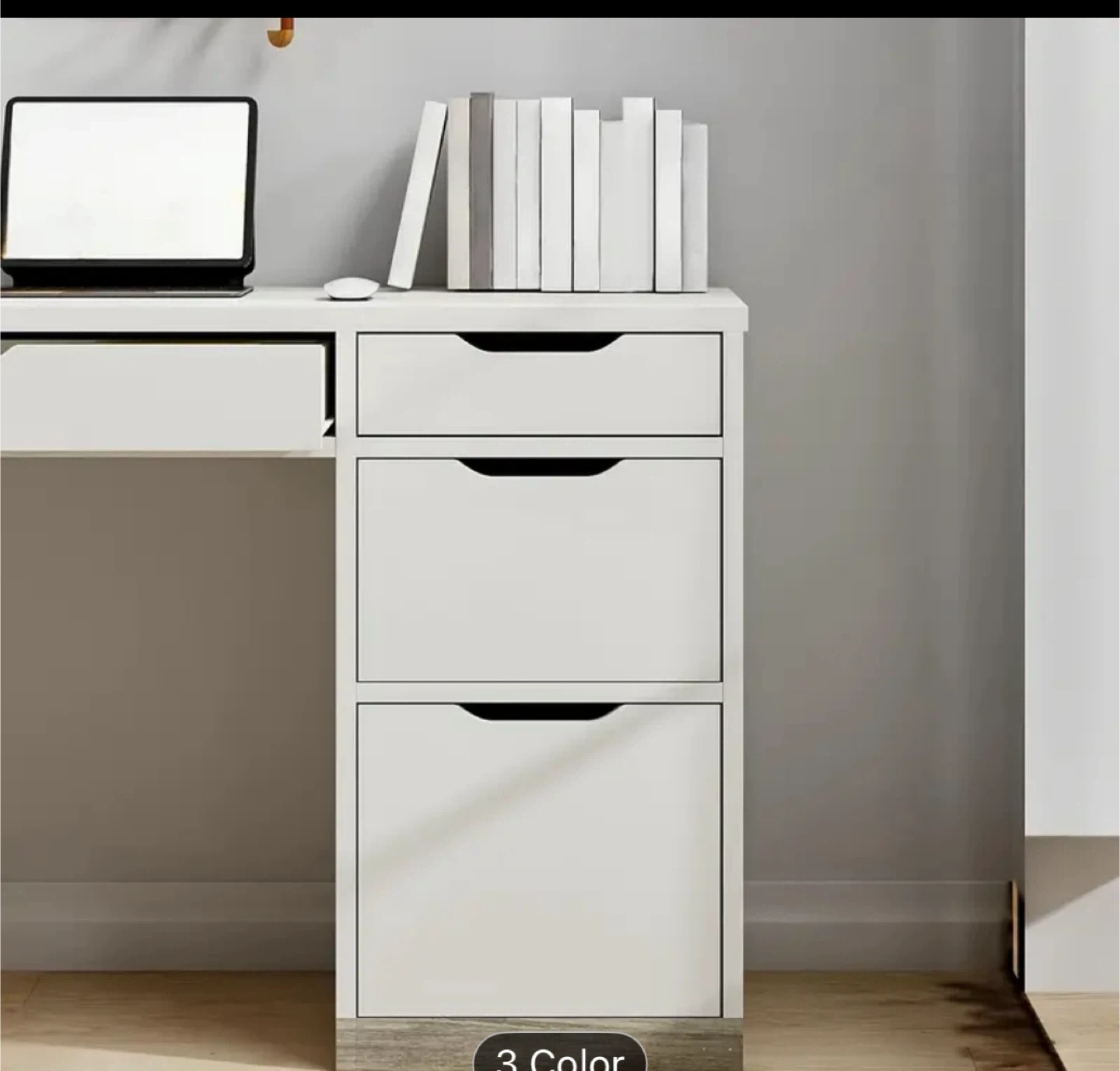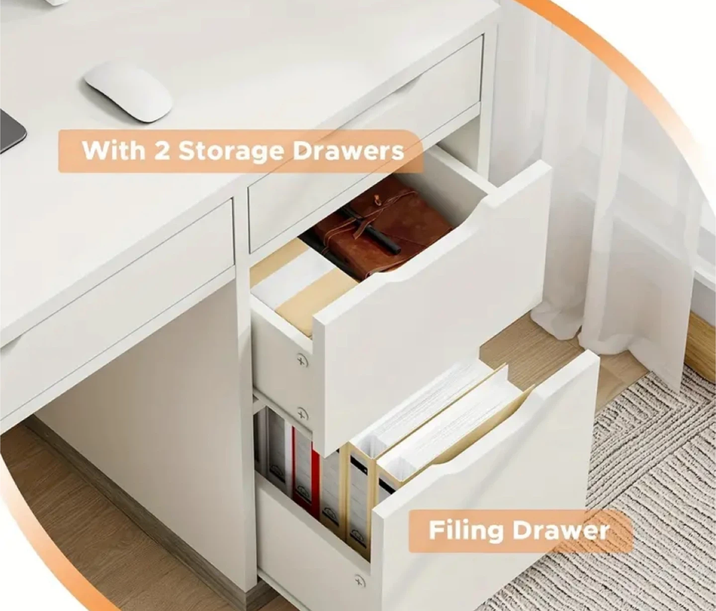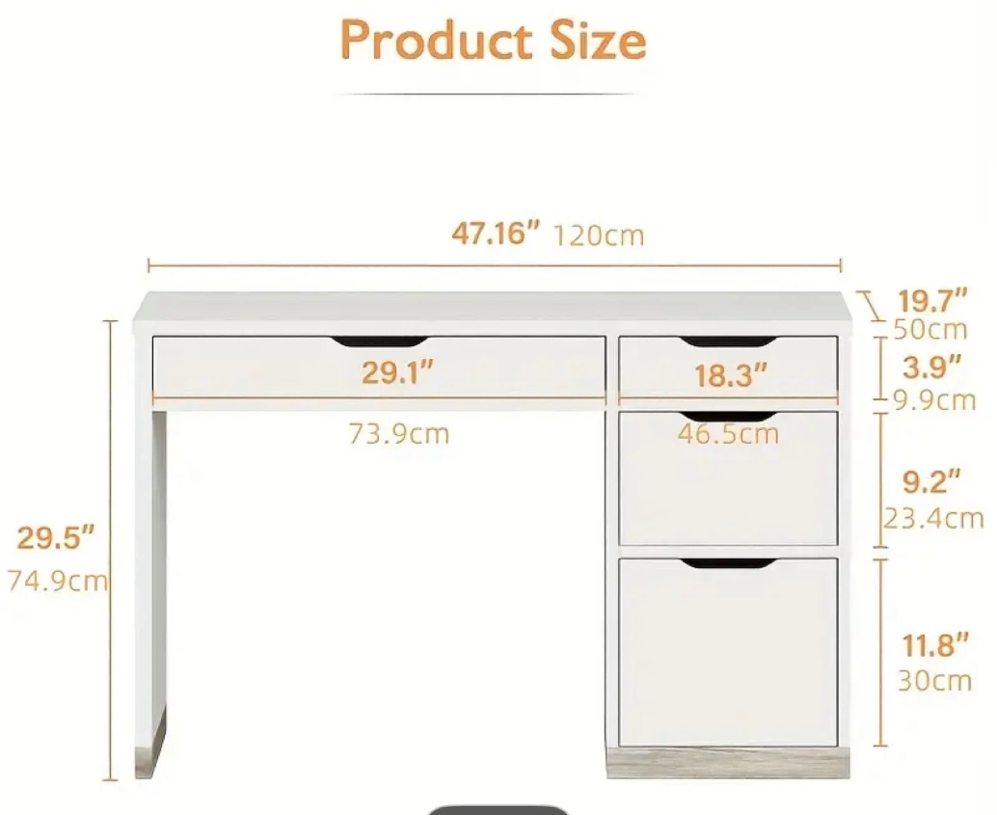 10Selling a white desk with drawers. It features two storage drawers and one filing drawer. The desk measures approximately 47.16" in length, 29.5" in height, and 19.7" in depth. it is brand new in box but it is a little damaged on top of the table but it burly see it.