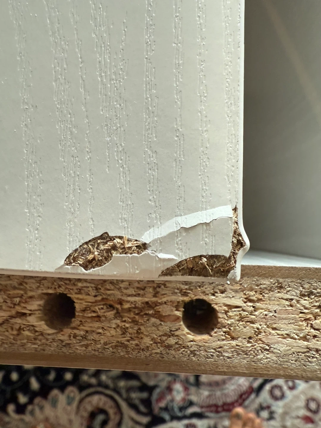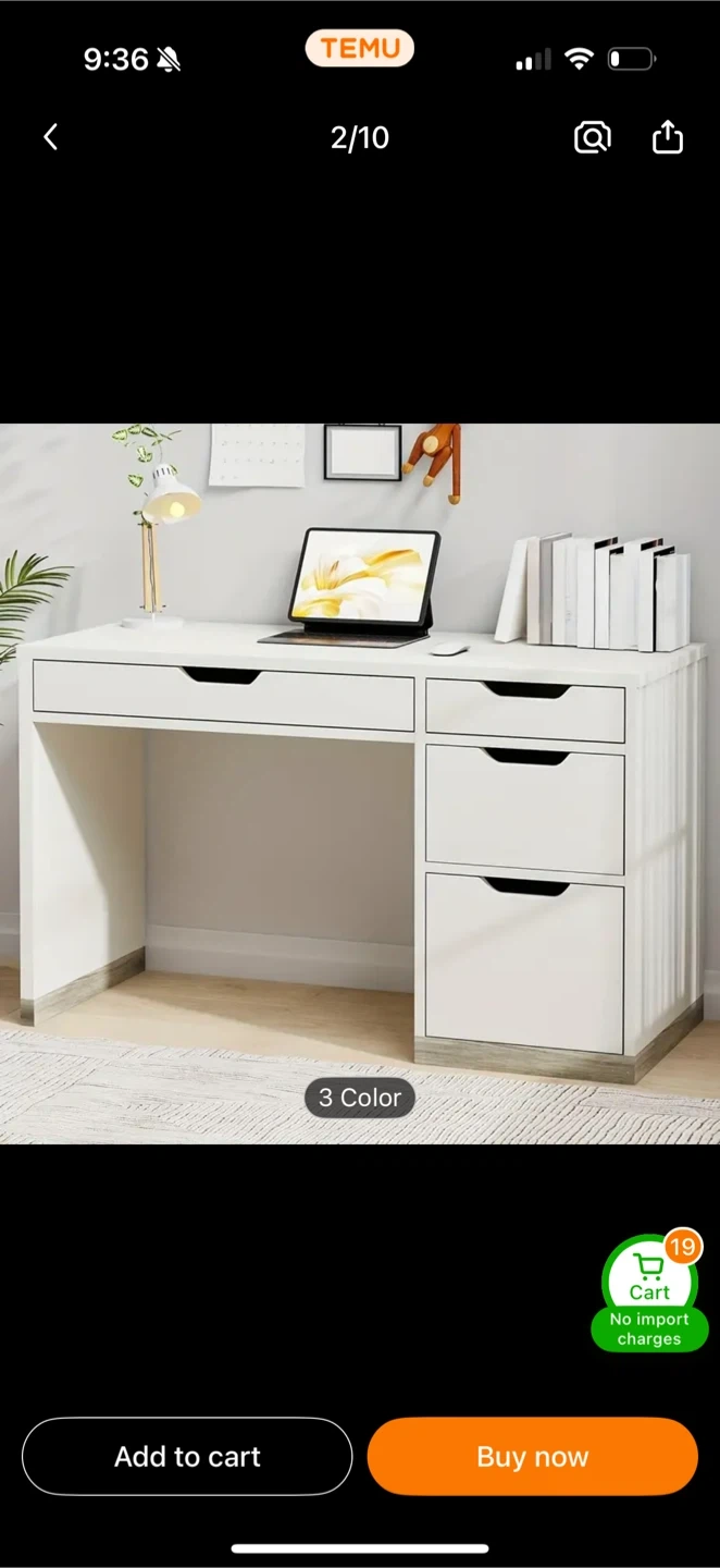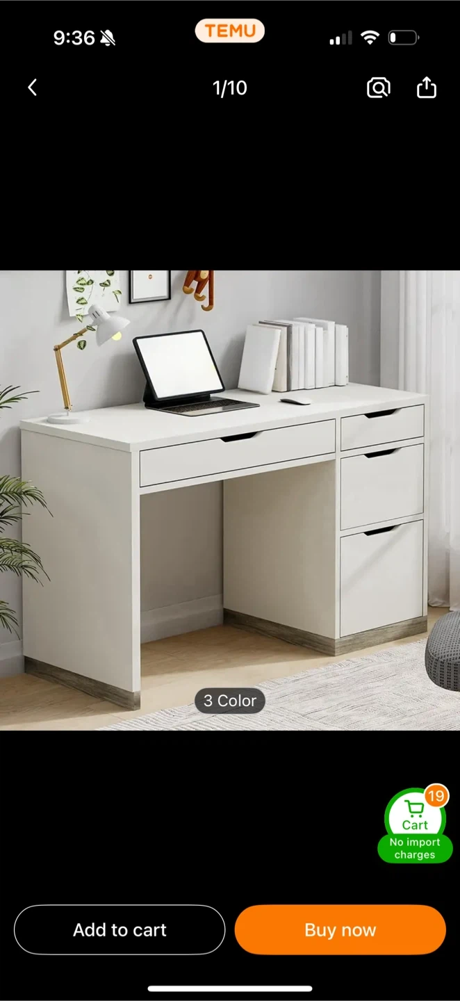 10Selling a white desk with drawers. It features two storage drawers and one filing drawer. The desk measures approximately 47.16" in length, 29.5" in height, and 19.7" in depth. it is brand new in box but it is a little damaged on top of the table but it burly see it.
