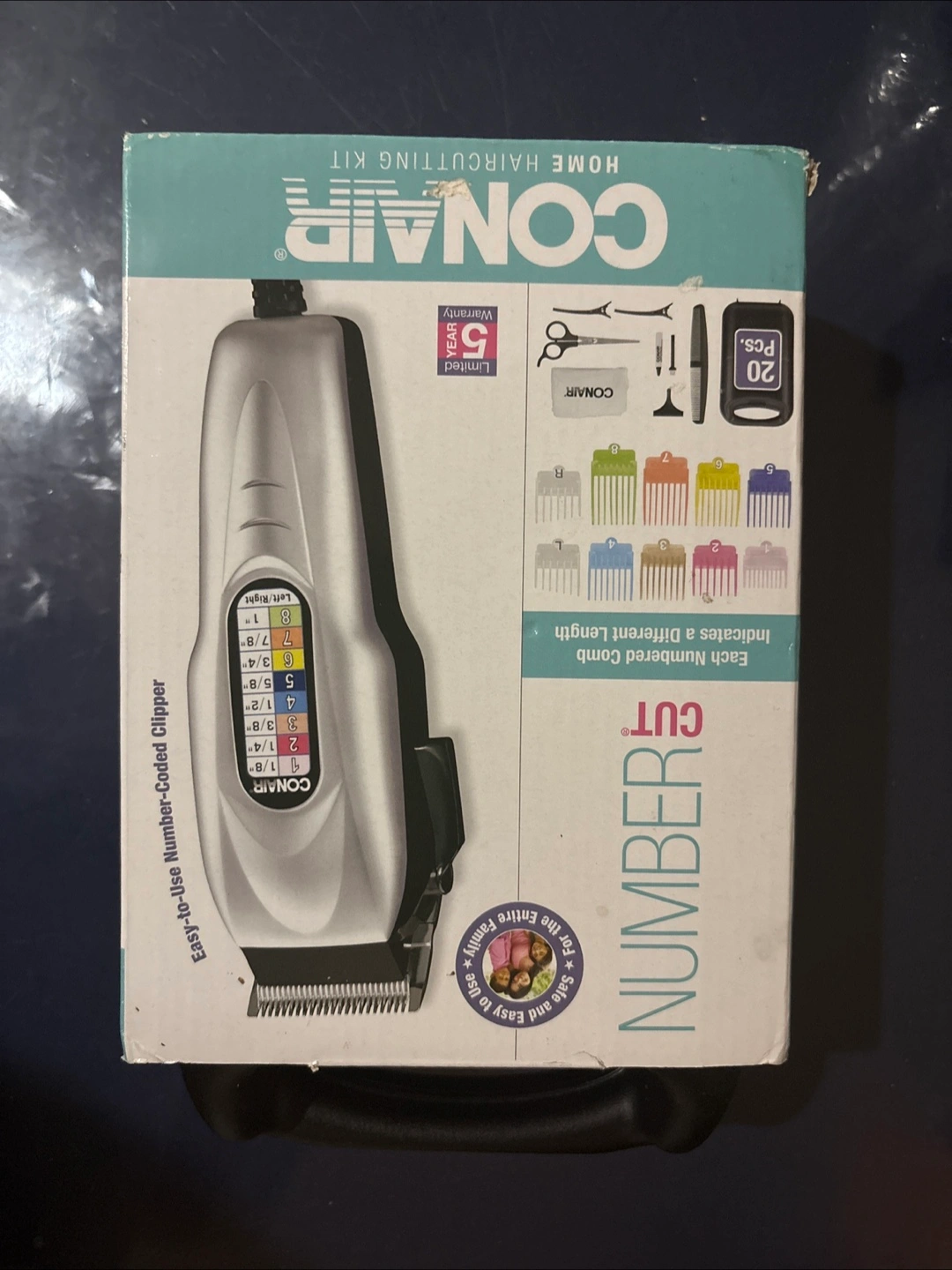 Selling a Conair home haircutting kit. It features an easy-to-use number-coded clipper and each numbered comb indicates a different length. Includes 20 pieces and has a 5-year limited warranty. Safe and easy to use for the entire family!