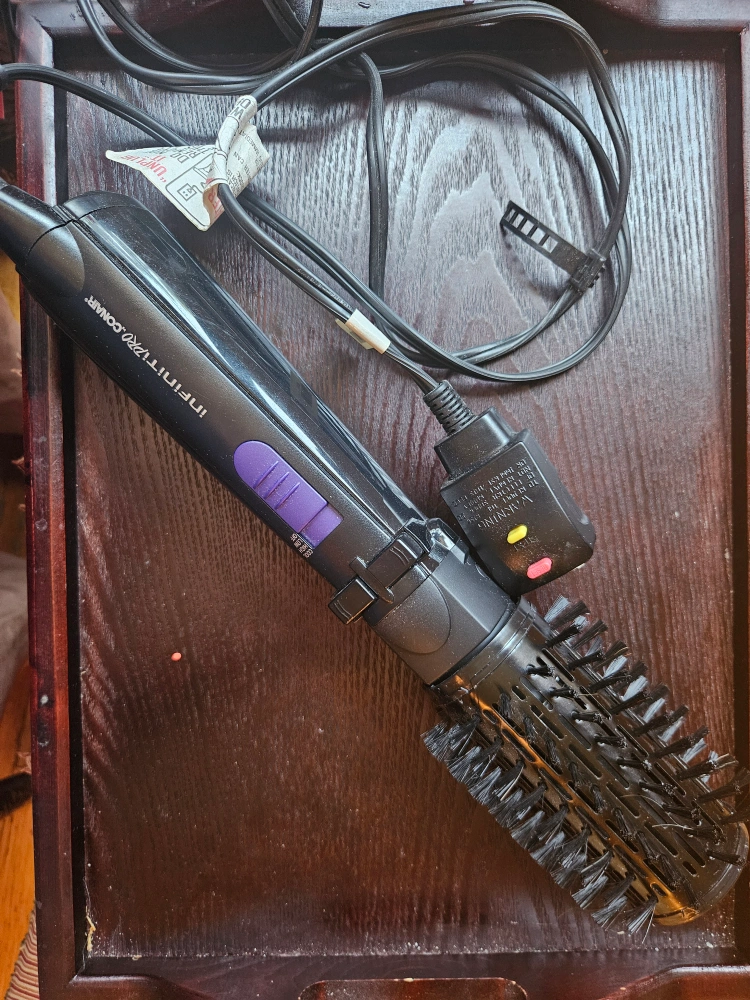 88Selling a Conair Infiniti Pro hot air brush - It dries! It curls! Let my inability to use hair styling devices be your beauty bargain. It has settings for cool, high and low. The dimensions are 13 inches long and 2 inches wide across the barrel. Cord is 5 feet long. Model BC173 on 110 volts and 250 watts.