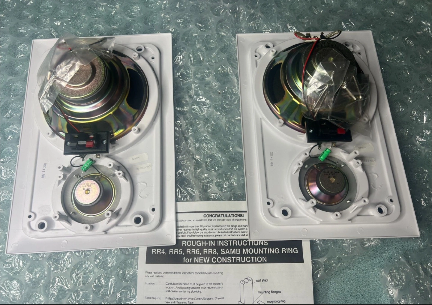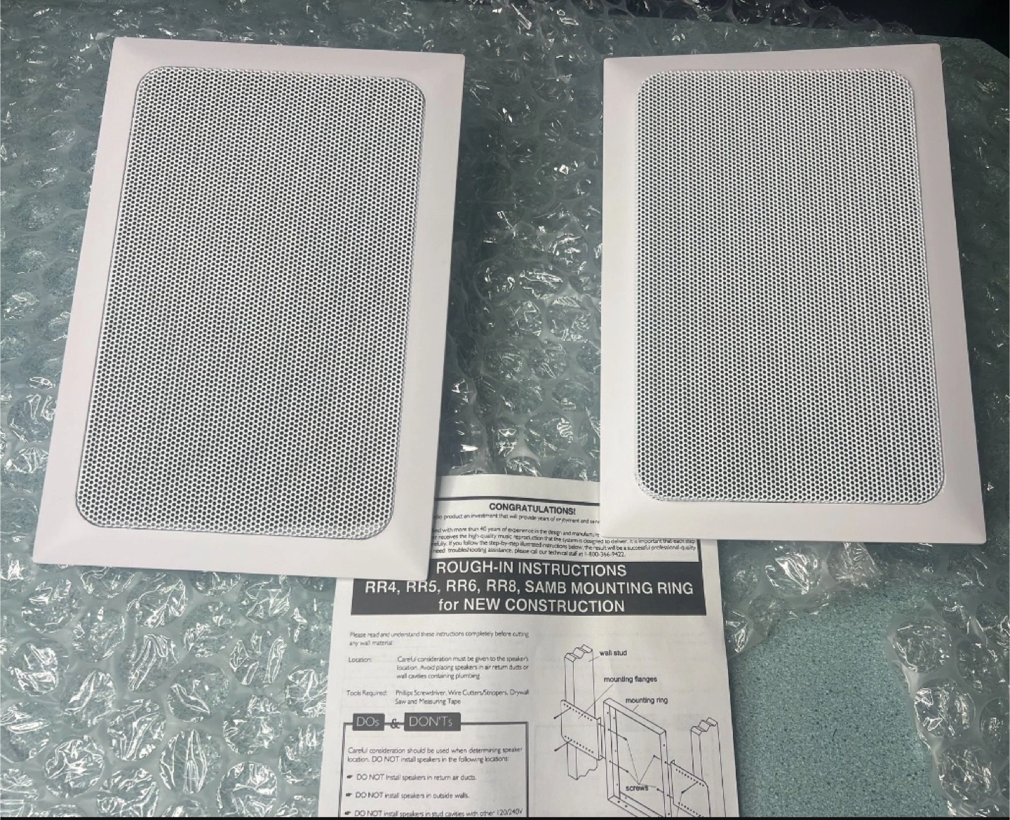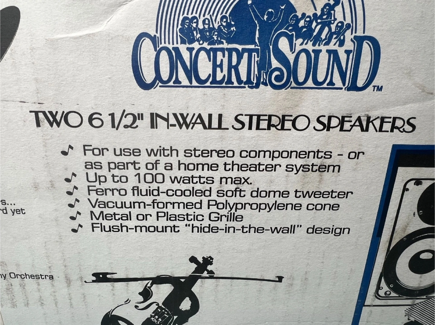 73Pair of in-wall speakers. New old stock. Includes mounting rings and hardware. Up to 100 watts max. Ferro fluid-cooled soft dome tweeter. Metal or plastic grille.