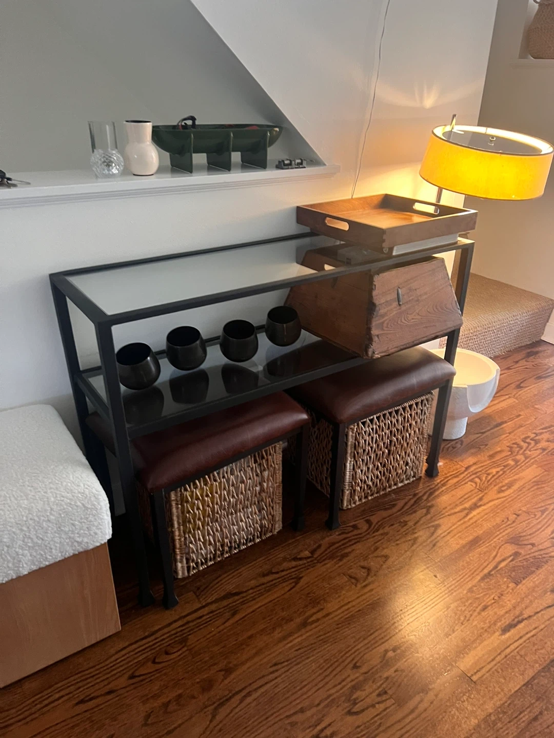 Selling a shelf with a glass top and a black metal frame! It's in great condition and would be great for storage or display. It has a modern look that could fit well in any room+ leather stools.