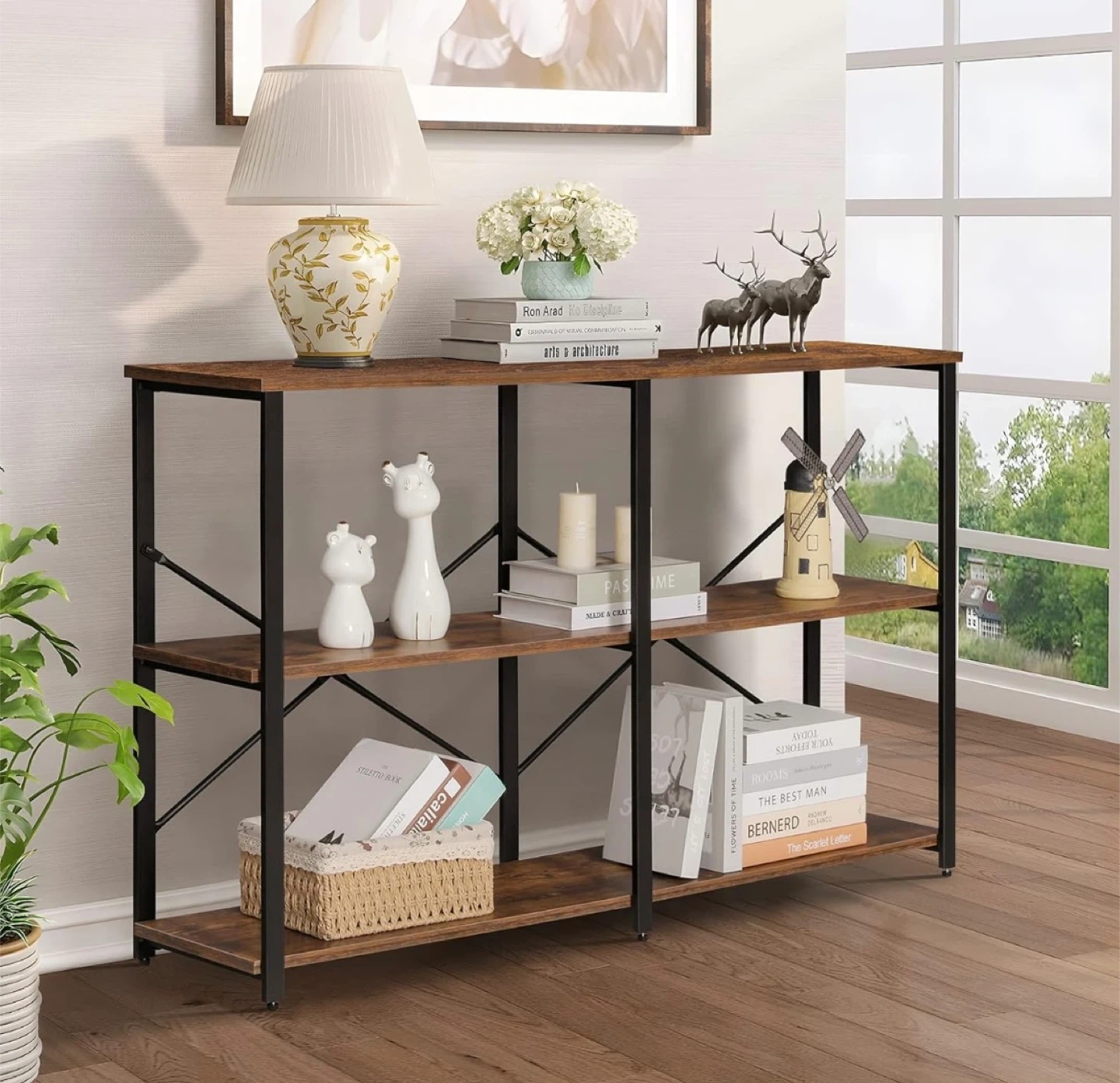 15This console table features a rustic brown finish with a black metal frame, perfect for adding a touch of industrial style to your entryway or living room. It has three tiers of open shelving, offering plenty of space to display books, plants, and other decorative items. The sturdy construction ensures it can hold a variety of items securely If interested, ready to be picked up starting from December 9