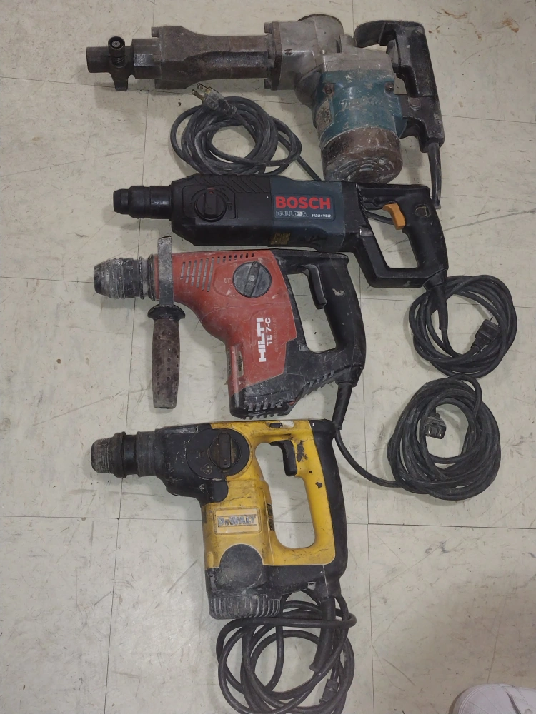 10Selling a collection of used rotary hammer drills from Bosch, Hilti, and DeWalt. All are in working condition, but show signs of wear from previous use. Perfect for someone looking for reliable tools at a good price. 718 790 5095