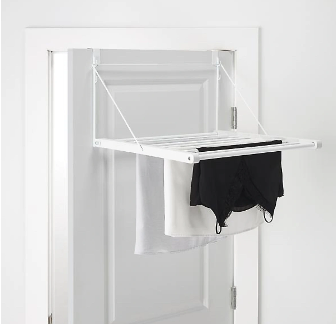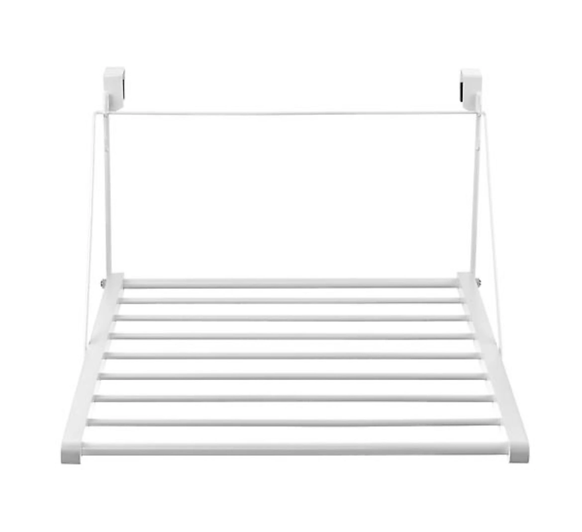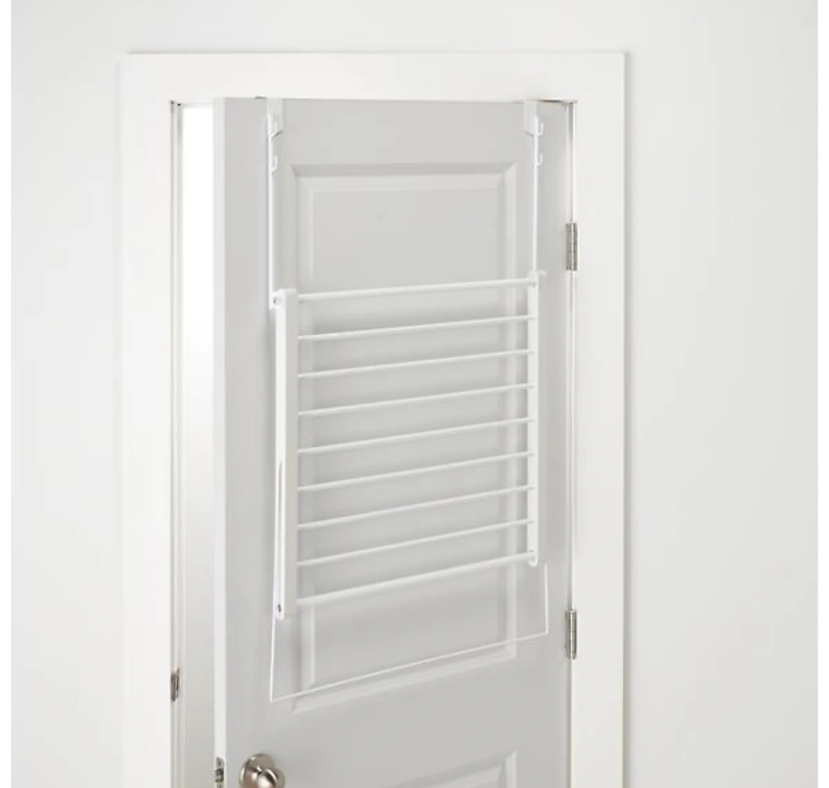 White over the door drying rack. Folds flat when not in use. Good for towels or clothes. Easy to assemble. No tools required.