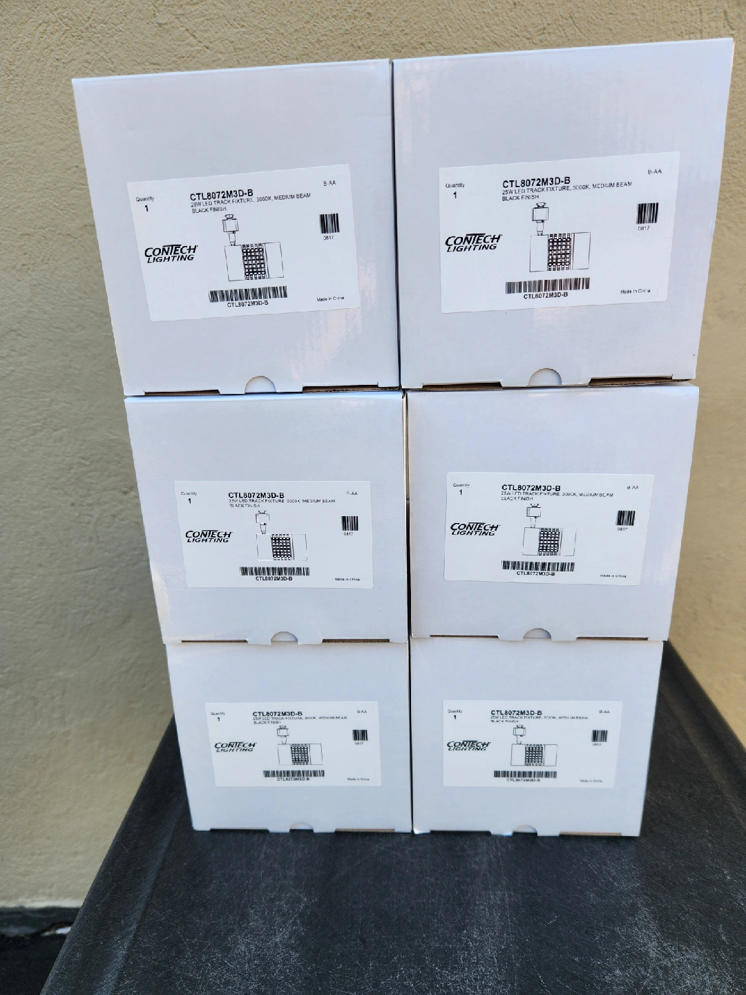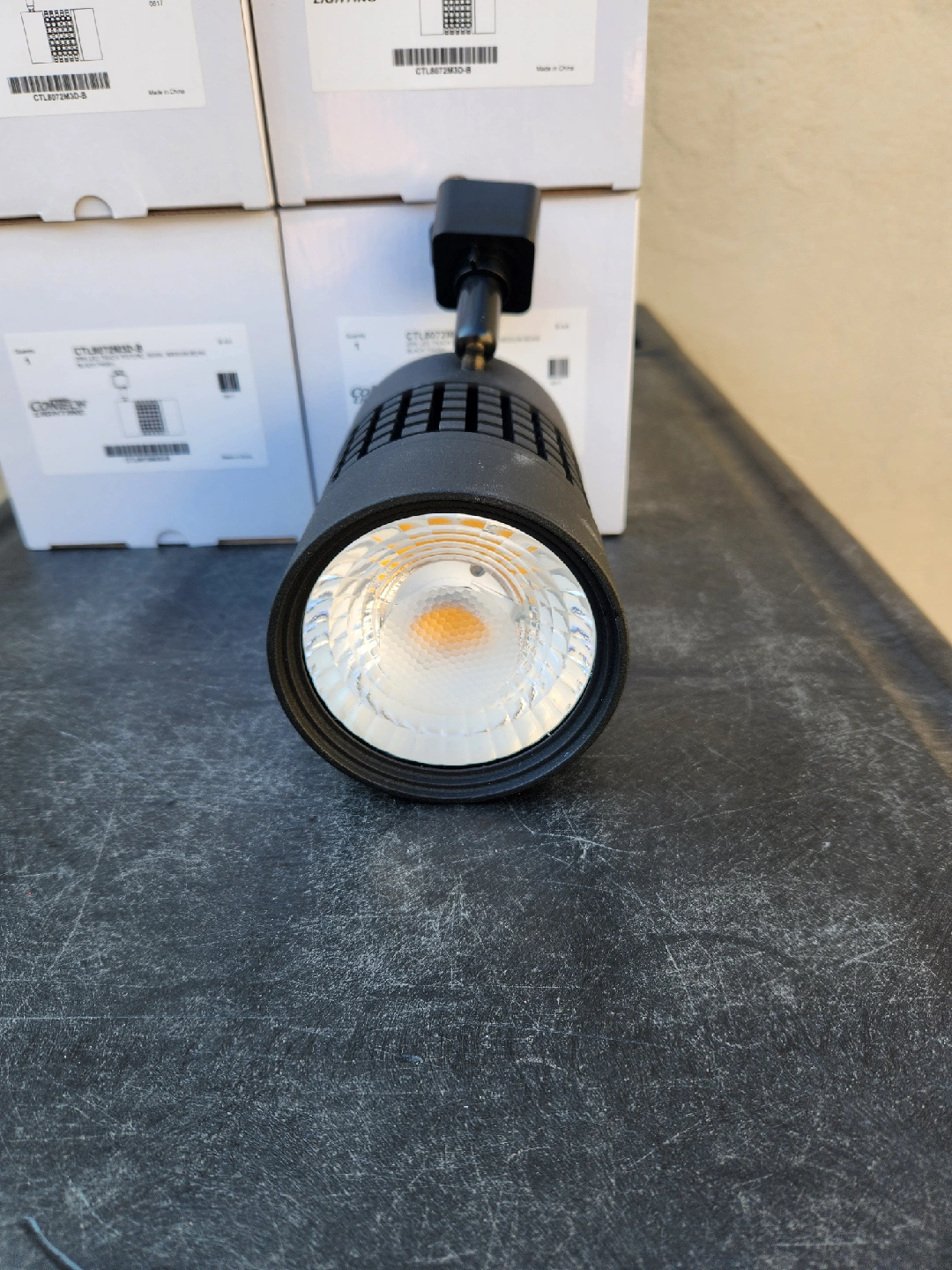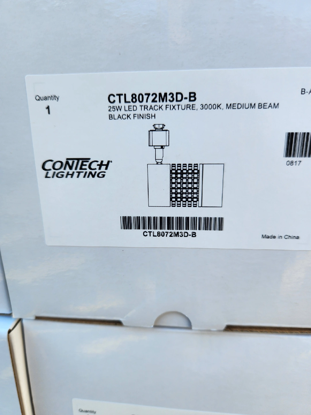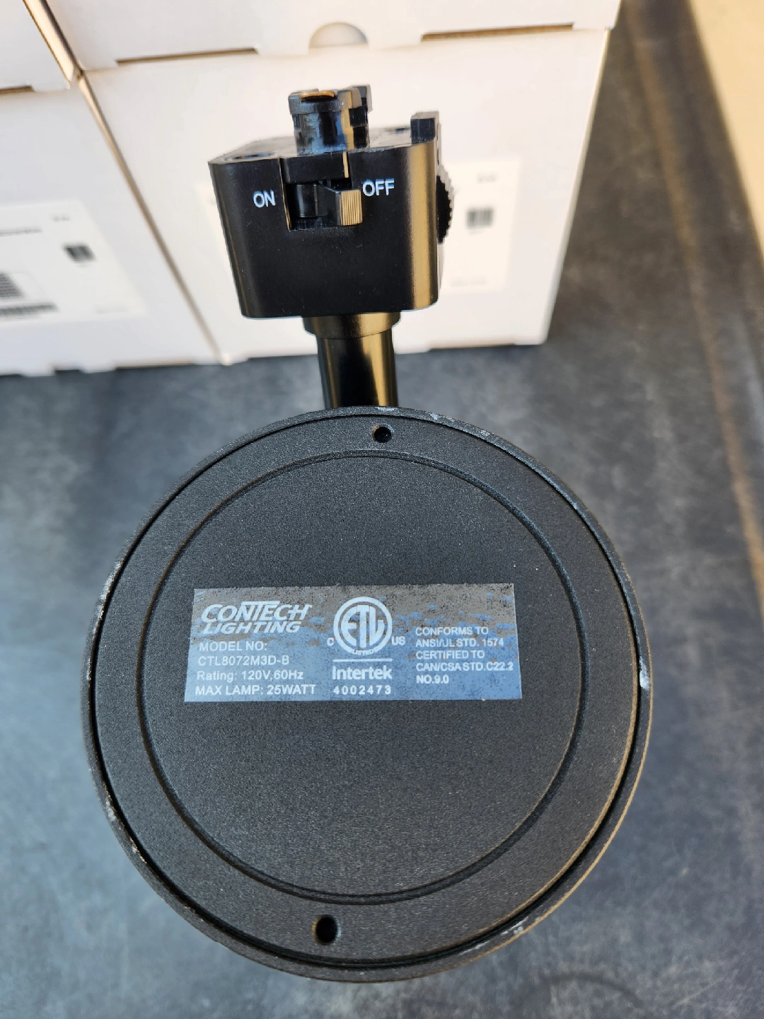 Selling a Contech Lighting 25W LED track fixture. It's a medium beam with a black finish. Model number is CTL8072M3D-B. The maximum lamp is 26W. It conforms to ANSI/UL STD. 1574 and certified to CAN/CSA STD.C22.2 NO.9.0