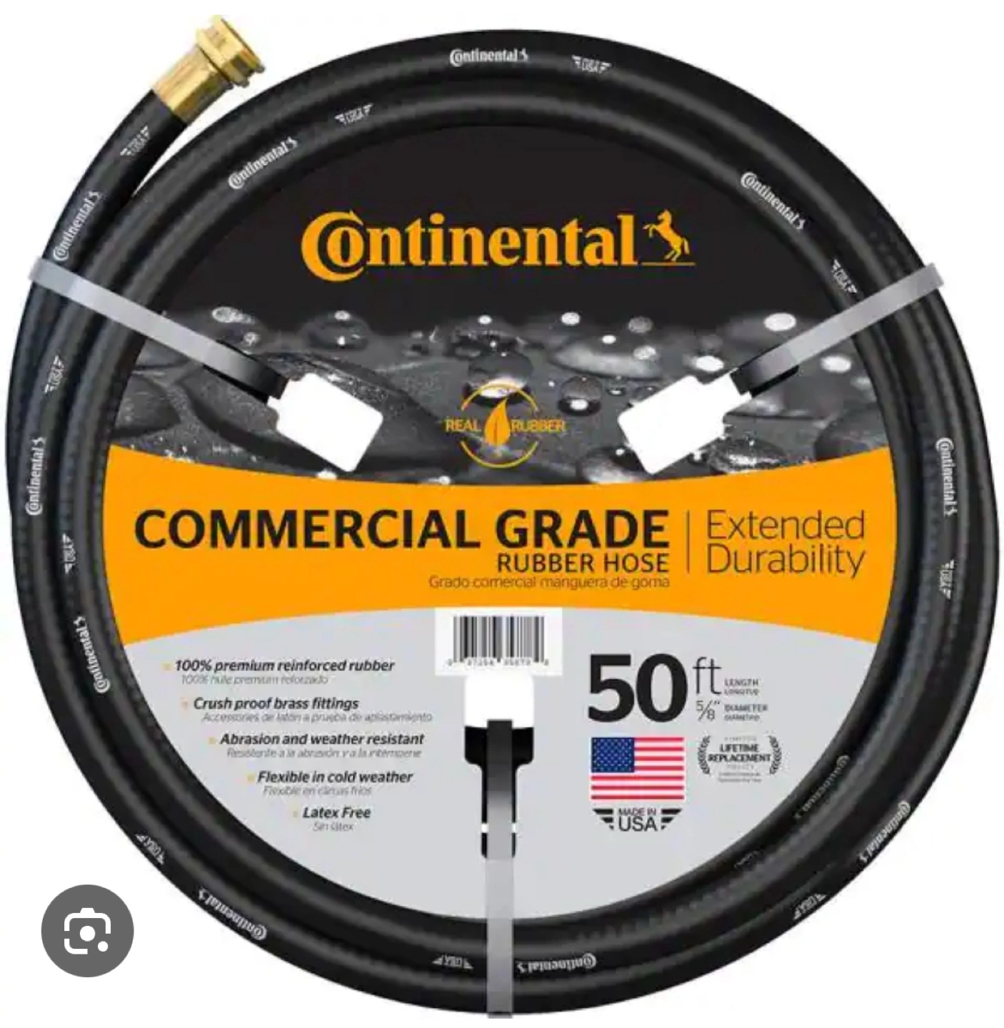 Selling a Continental Commercial Grade Rubber Hose! It's 50 ft long with a 5/8" diameter. This hose is abrasion and weather resistant, and flexible in cold weather. It's also latex free and has crush proof brass fittings