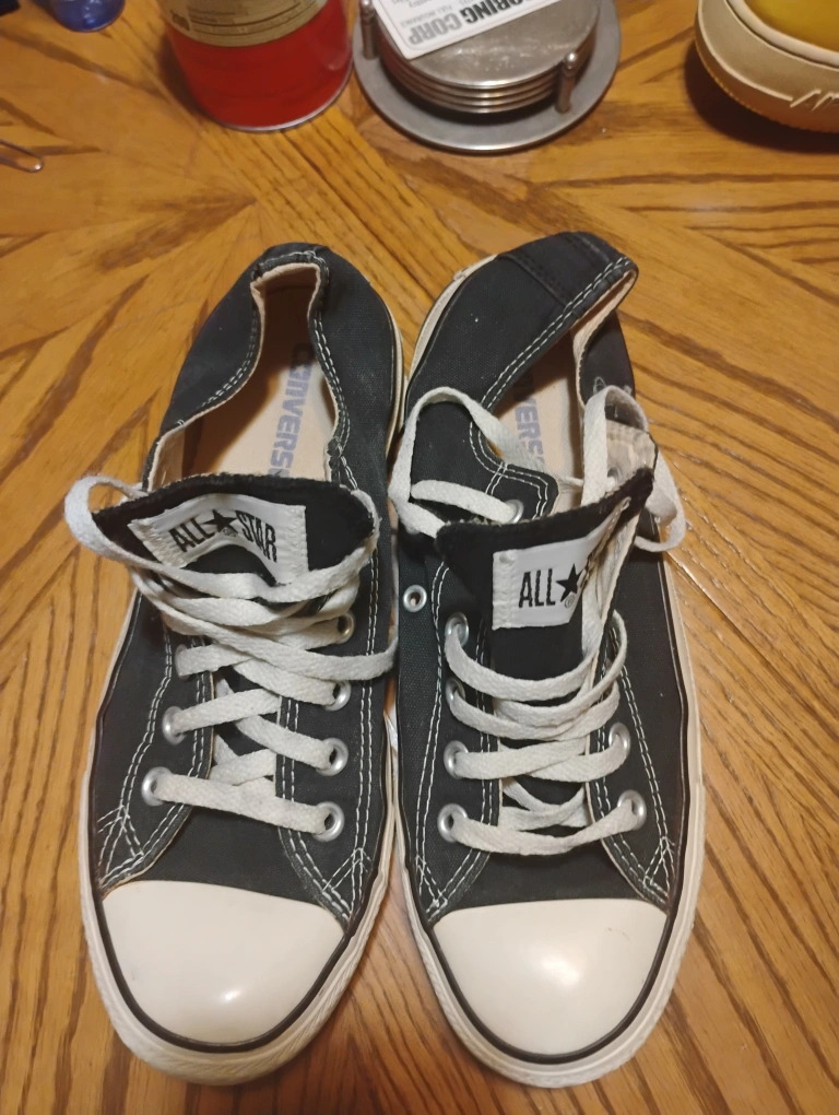 Selling a pair of Converse All Star sneakers in black. They show some signs of wear, as seen in the photos, but still have plenty of life left in them! The classic design goes with everything