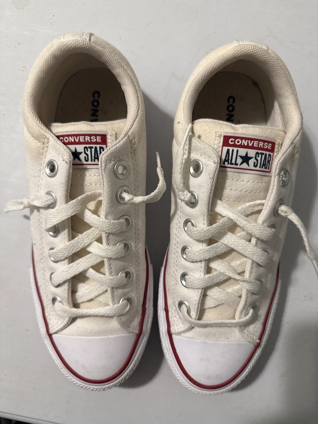 Selling a pair of Converse All Star sneakers in a cream color! They're in great condition and ready for a new home. Perfect for casual wear or dressing up an outfit. Size 4.5 please refer to the photos for details