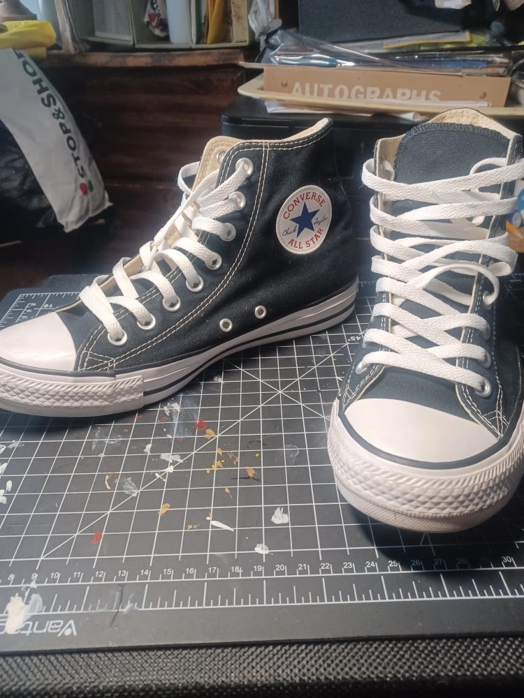 Black high top Converse All Star sneakers. Classic style. Used, fully cleaned and sterilized. Slight wear of back logo tabs on both shoes.