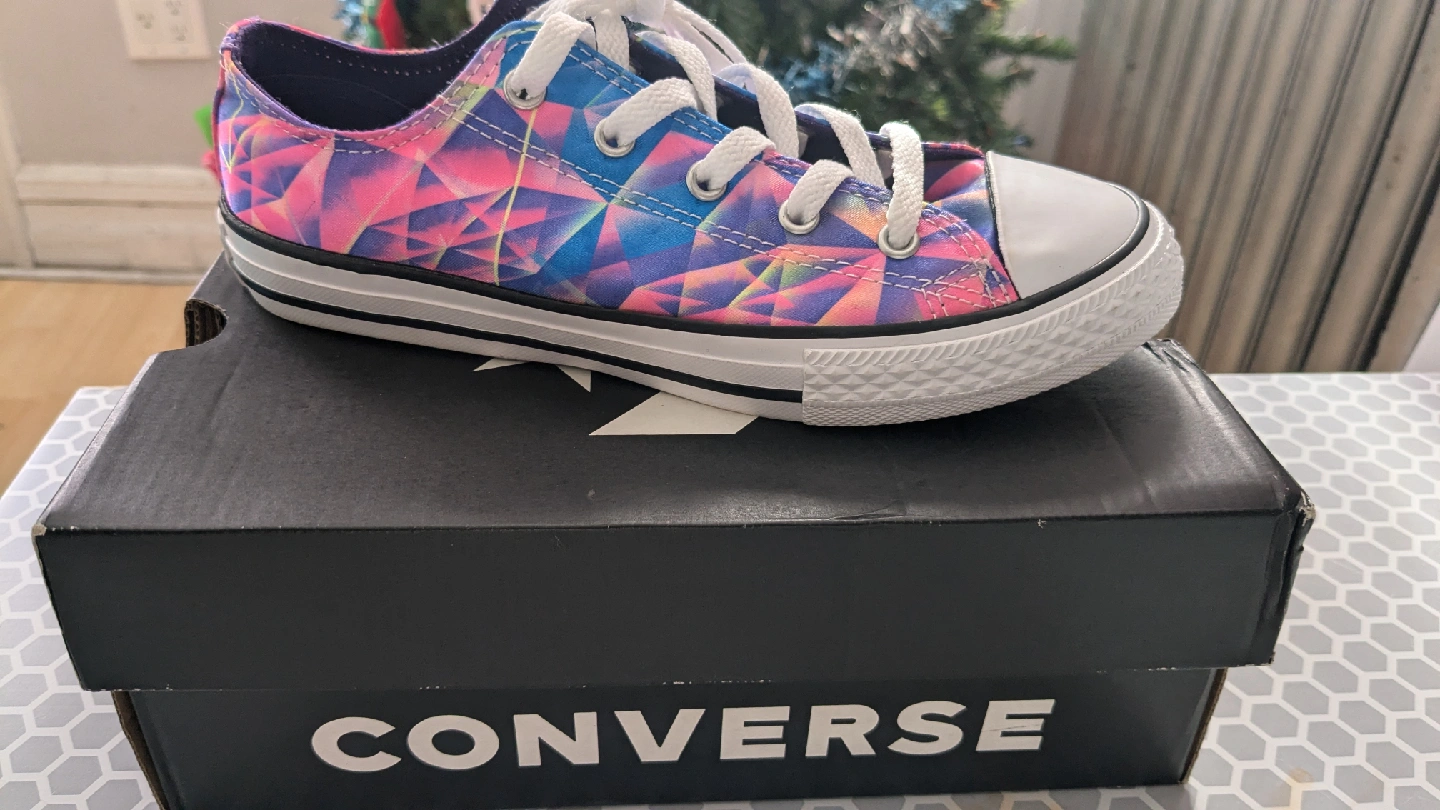 Selling a pair of Converse All Star youth size 3 shoes. They come with the original box. The color is a fun mix of blue, pink, and white!