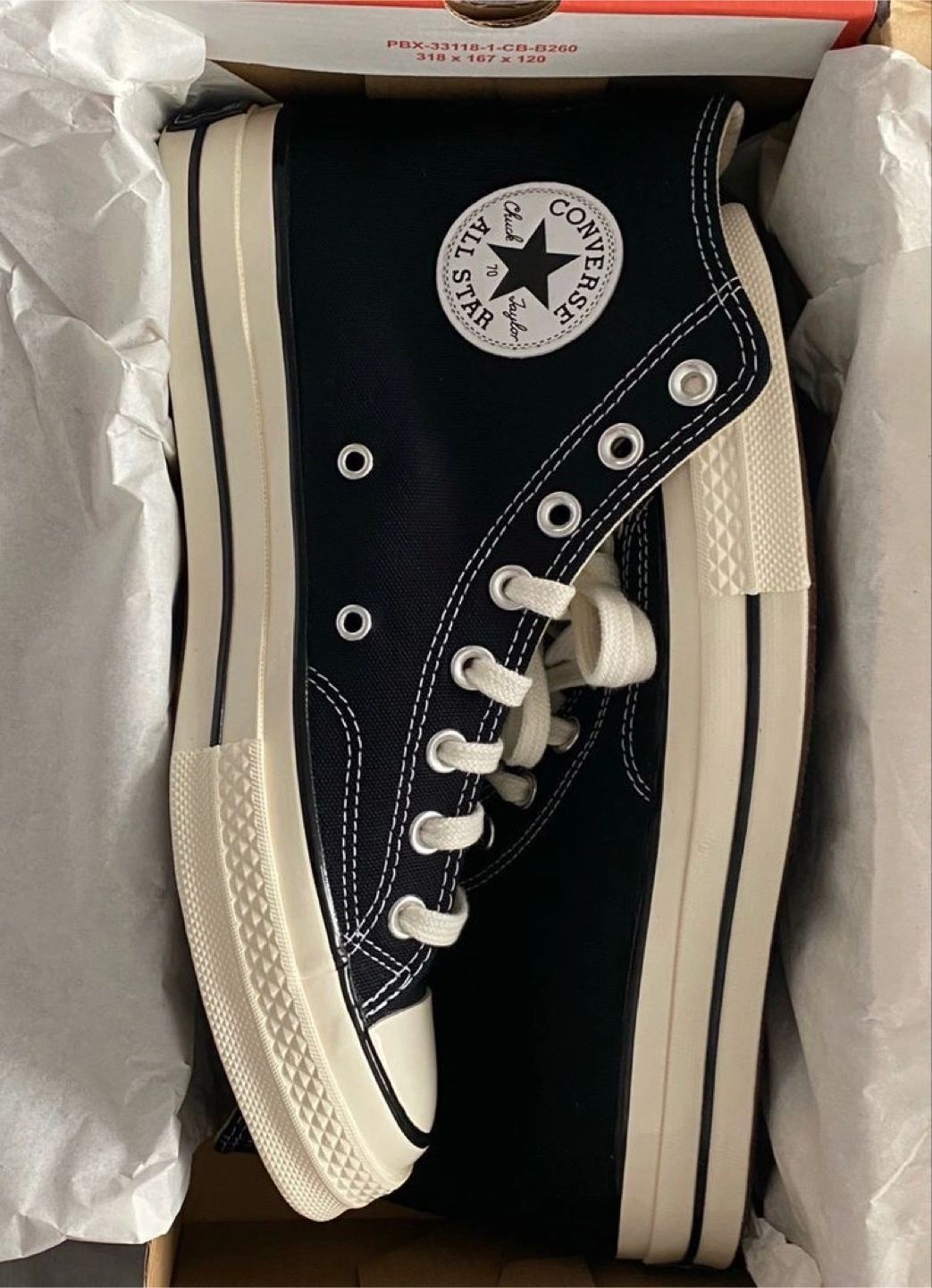 Selling a pair of classic Converse Chuck 70 High Tops in black! These are a timeless staple that goes with everything. They're in great condition and come with the original box. Never used. Wrong size need to get rid of them.