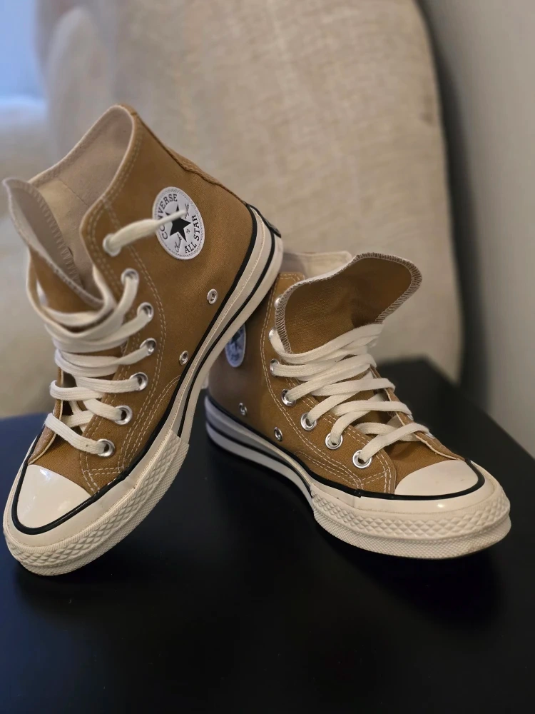 73Selling a pair of Converse Chuck Taylor All Star high tops in a lovely tan color. They are in great condition and ready for a new home! The size is a women's 4.5 a 5.