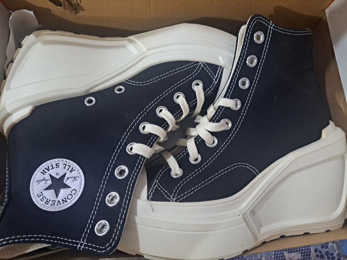 10Selling a pair of Converse Chuck Taylor All Star Run Star Hike High Top sneakers! They feature the classic Chuck Taylor design with a modern, chunky platform sole. The upper is a durable canvas material in black, complemented by the iconic Converse logo patch. These shoes are sure to add a stylish edge to any outfit!