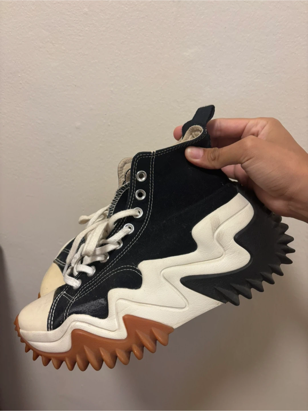 55Selling a pair of Converse Run Star Motion high top sneakers! They feature a black and white color scheme with a unique, wavy midsole design and a star detail on the heel. These sneakers are in great condition and ready for a new home