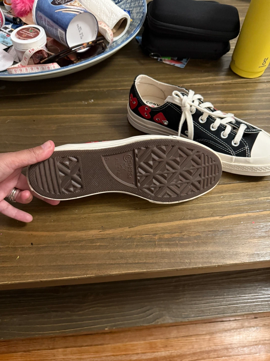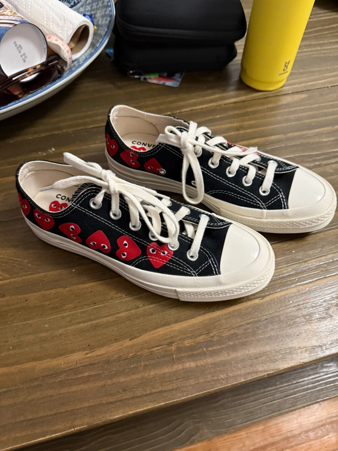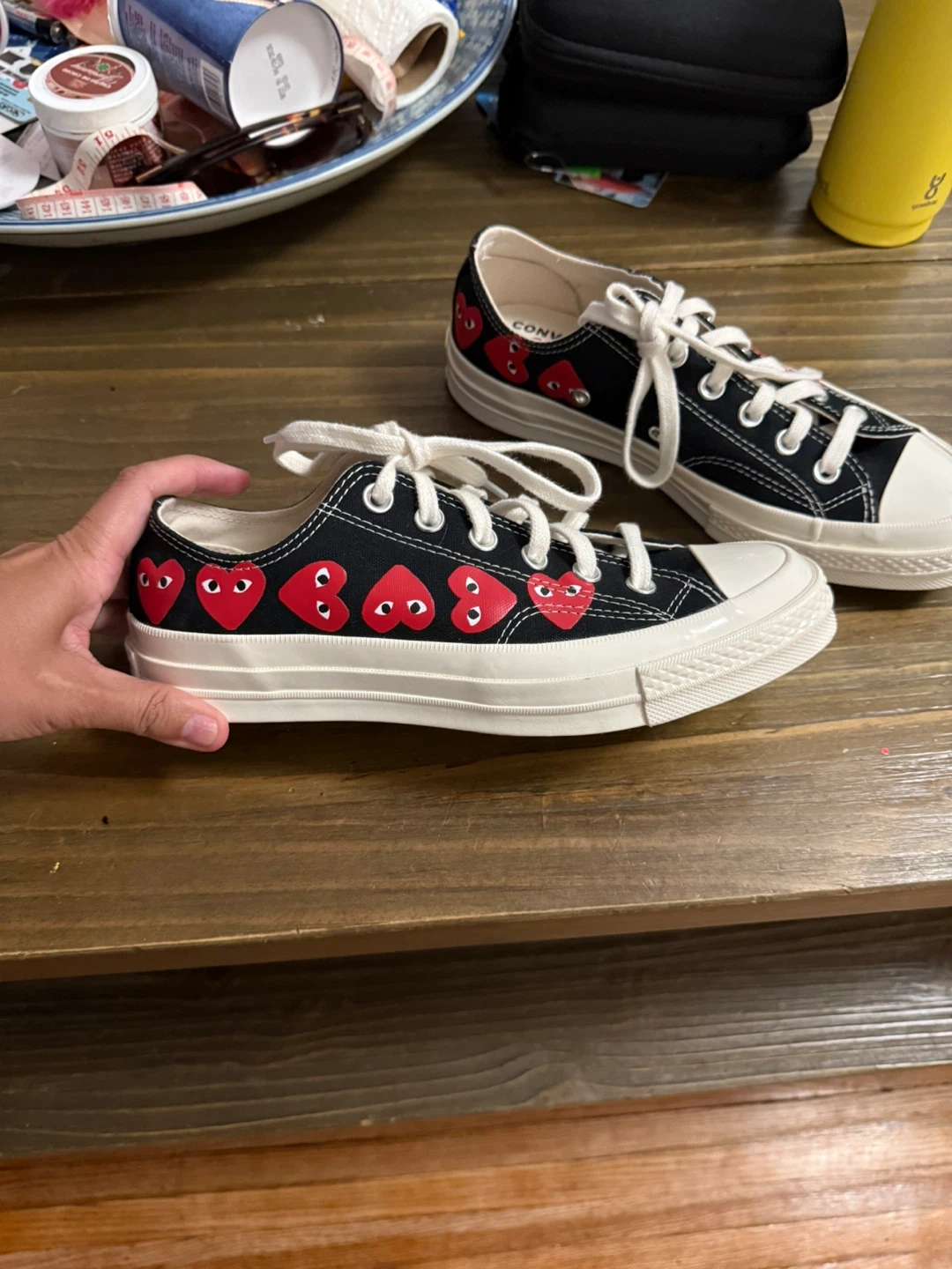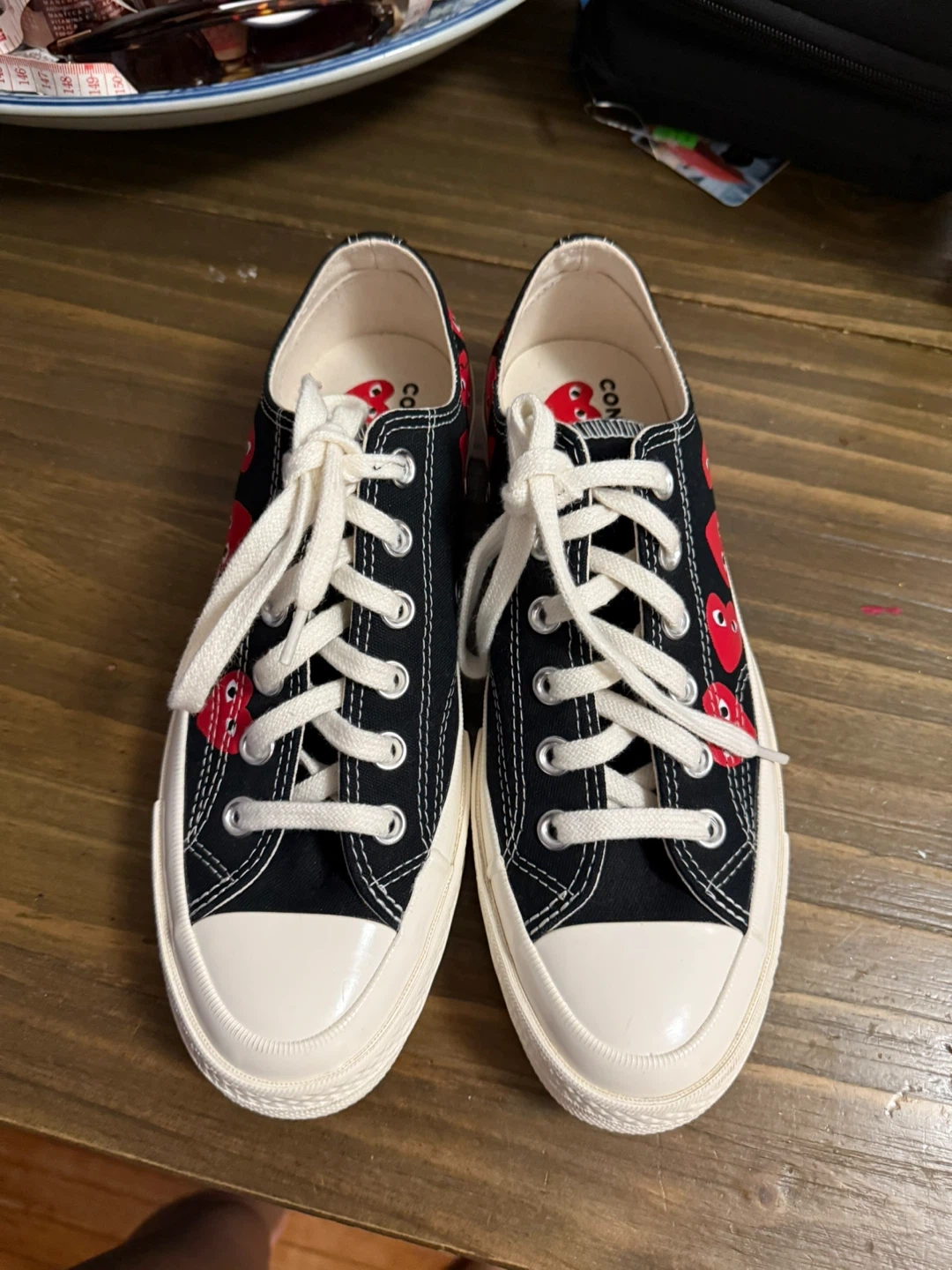 Selling a pair of Converse x Comme des Garcons PLAY Chuck 70 Low sneakers! These are a stylish collaboration featuring the iconic heart-and-eyes logo. They are black with white laces and soles, and the signature red heart is prominently displayed. Great for adding a unique touch to any outfit! Never worn