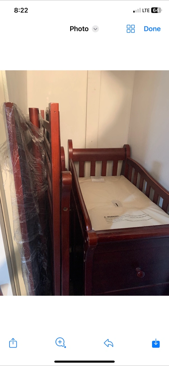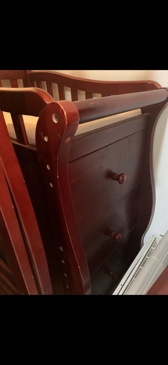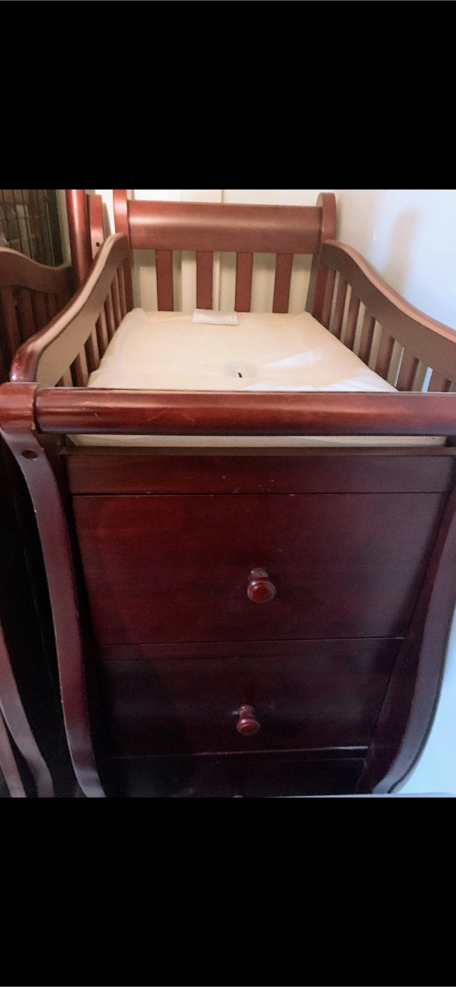 Selling a convertible crib with an attached changing table. It's in good condition and ready for a new home! The crib is a beautiful dark wood color.