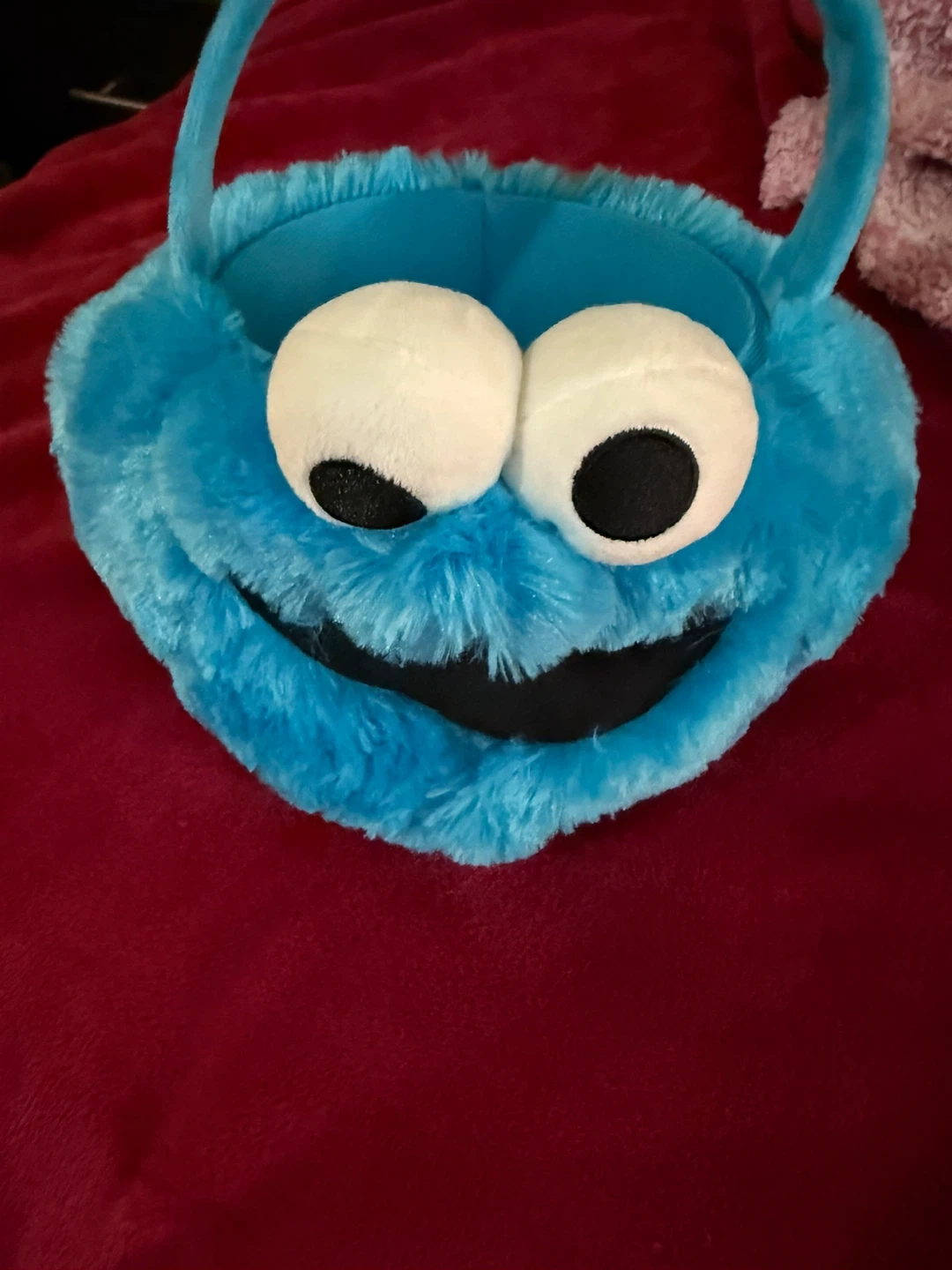 54This is a cute Cookie Monster plush basket! It's blue and furry, with big googly eyes and a wide smile. Perfect for holding small items or just for decoration