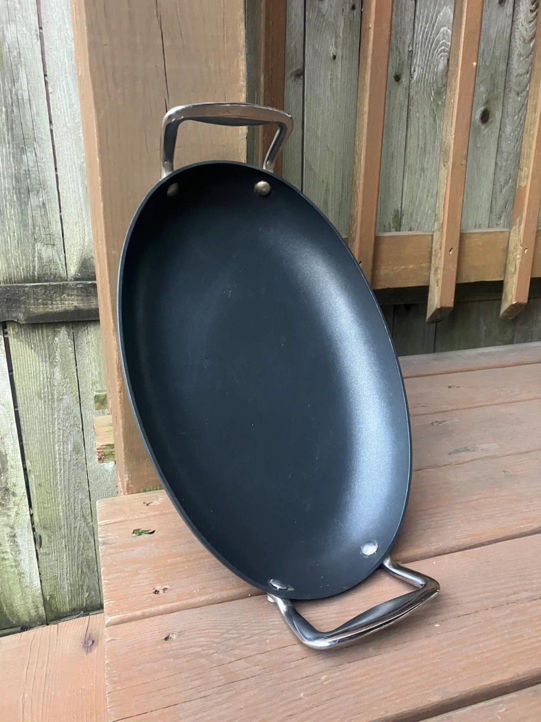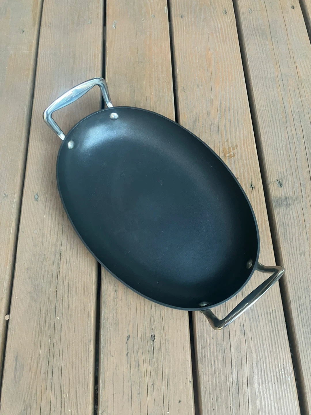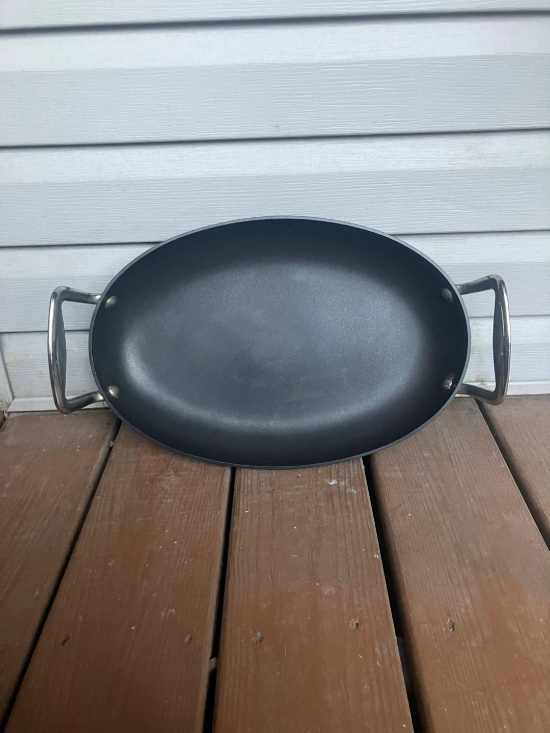 Cooks Essentials 15” Anodized Nonstick Oval Skillet Skillet is in excellent condition with no scratches or damage. Measures 15” x 10”. Large size allows for fitting over two stove burners for cooking bigger portions. Features solid metal handles with thick bolts. From a smoke and pet free home. Check out in person before purchasing. Thanks for looking.