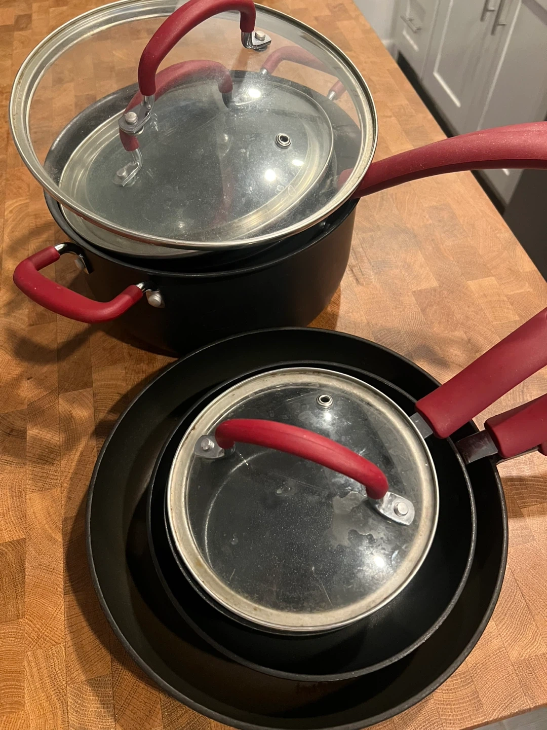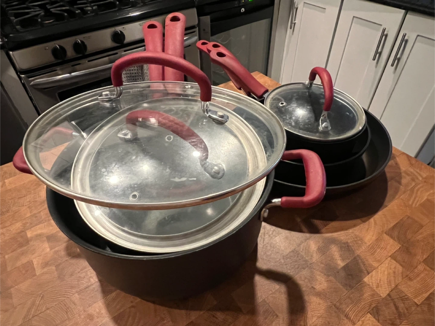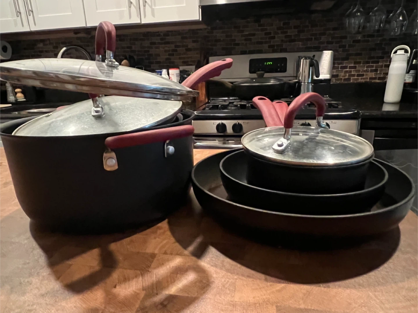 T-fal Ultimate Hard Anodized Nonstick Cookware Set [$40] Comes with all pieces shown (except spoon/spatula) - 1 large pan - 1 small pan - 3 pots with long handle - 1 large pot $40 OBO Used for 4 years (doesn't work with new induction stove). Good condition and cleaned but may need repeat cleaning. Oven & Dishwasher safe Pickup: 70 & Amsterdam