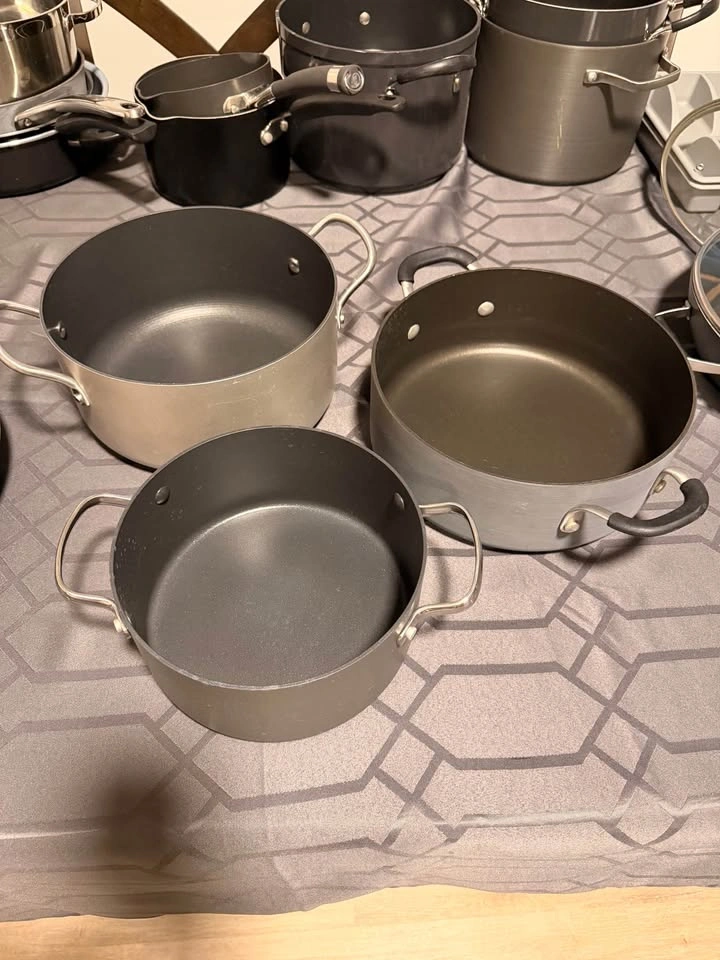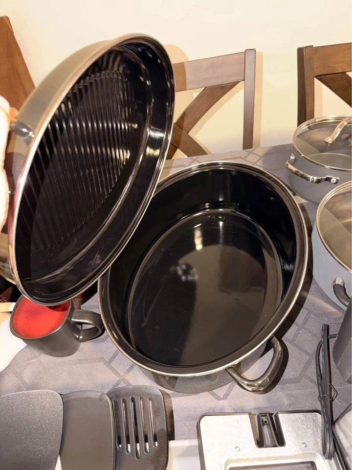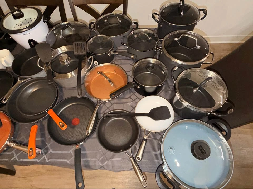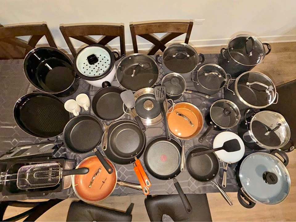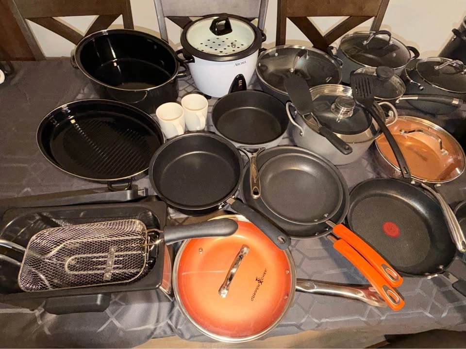 5Brand new: 23 pots & pans, a rice cooker/steamer, a deep fryer, 3 spatulas, 2 white mugs, and 15 fitting glass lids. Never used. Selling everything as a bundle (no time for individual item sales.) 🆕 housewarming gifts I don’t have space for ✨ Serious and reasonable offers only.