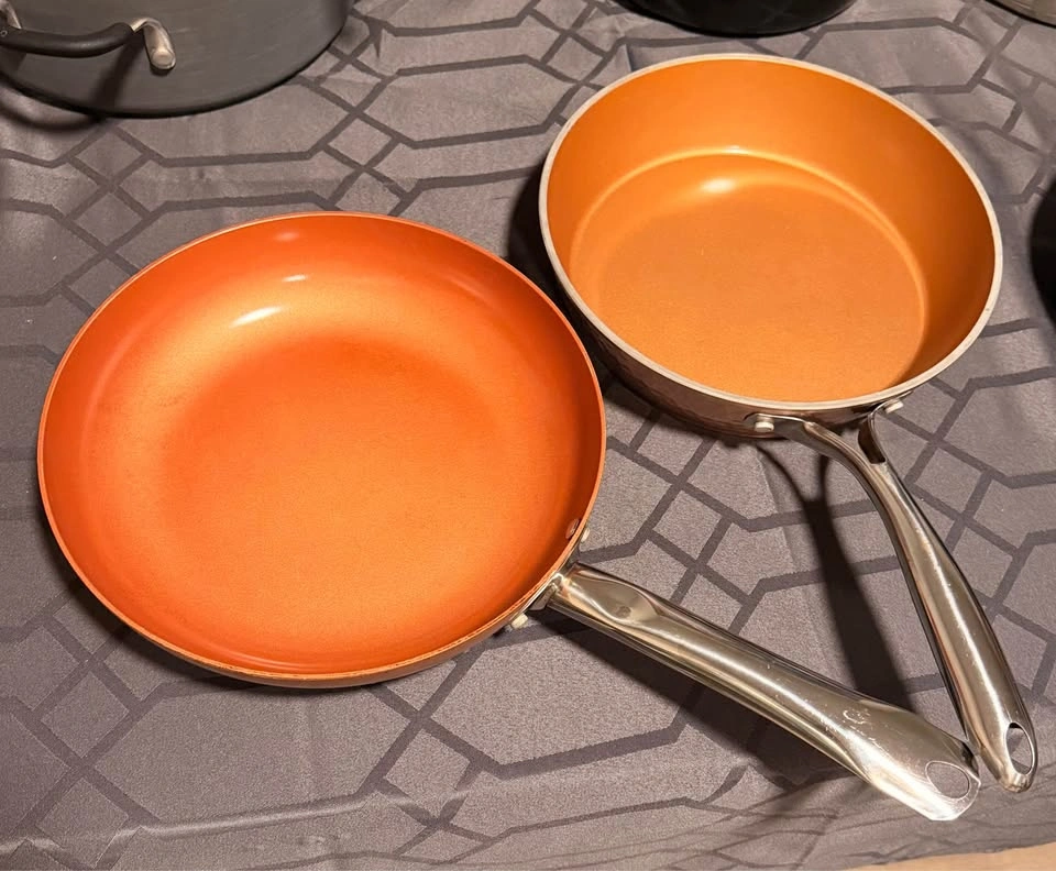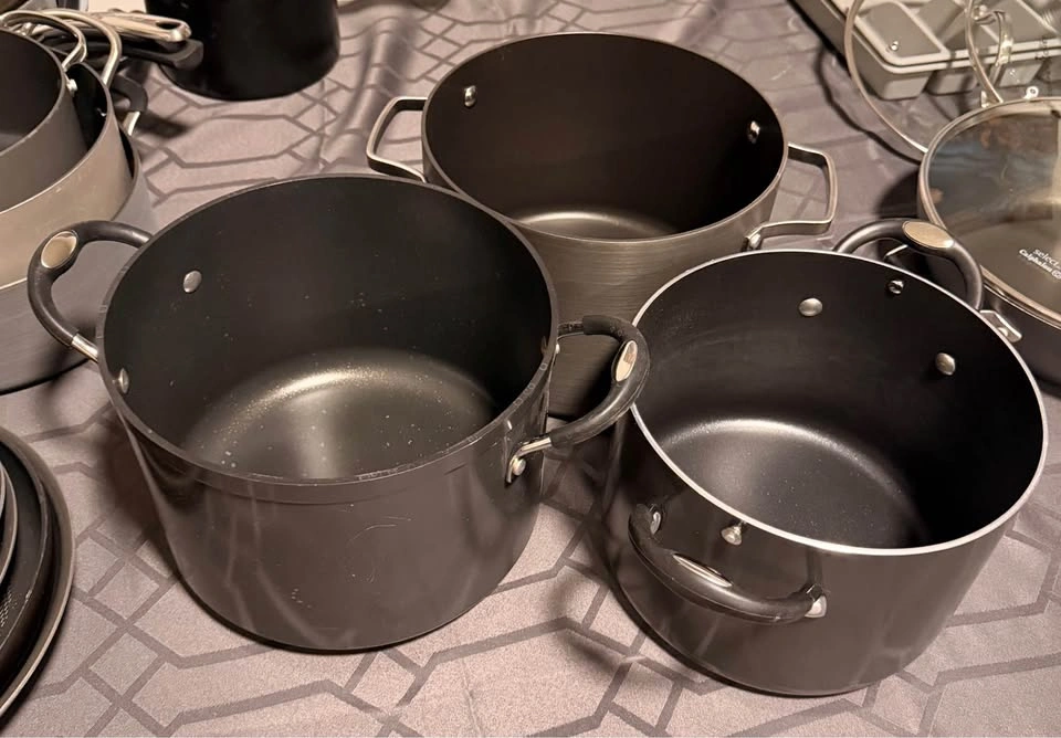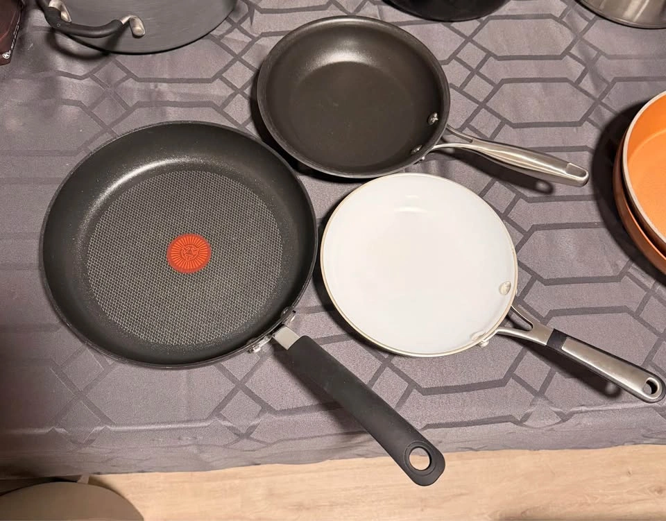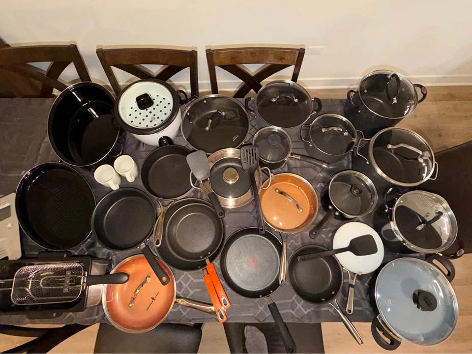 5Brand new: 23 pots & pans, a rice cooker/steamer, a deep fryer, 3 spatulas, 2 white mugs, and 15 fitting glass lids. Never used. Selling everything as a bundle (no time for individual item sales.) 🆕 housewarming gifts I don’t have space for ✨ Serious and reasonable offers only.