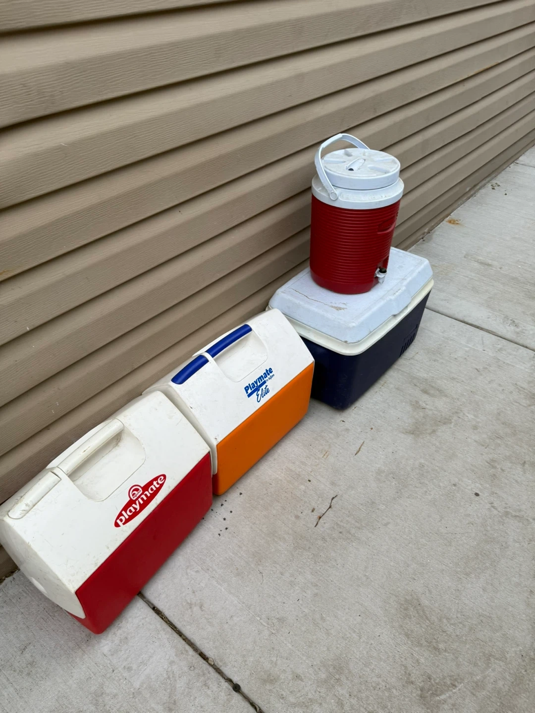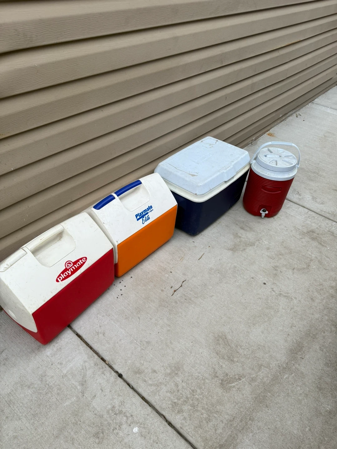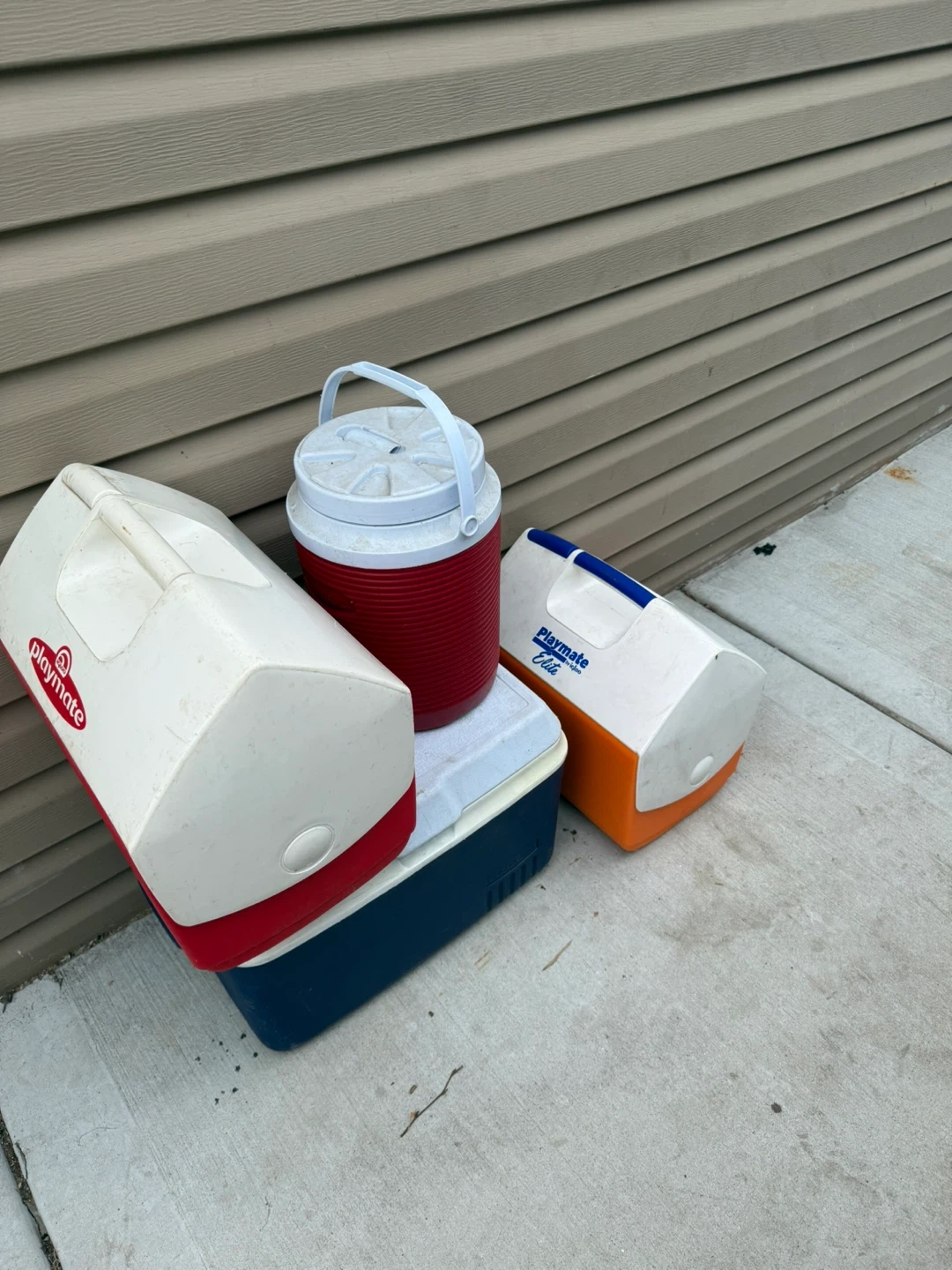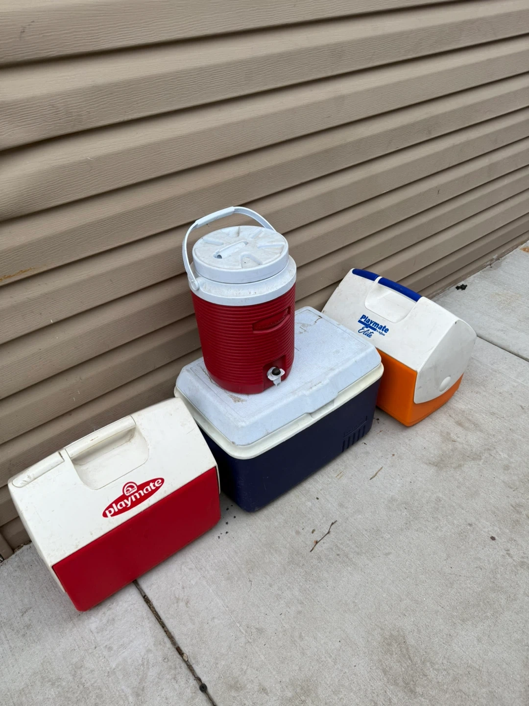 Selling a set of coolers! Includes a Playmate Elite cooler (white and orange), a red and white Igloo water cooler, and a blue and white cooler. They're all in used condition, but ready for your next picnic or outdoor event!