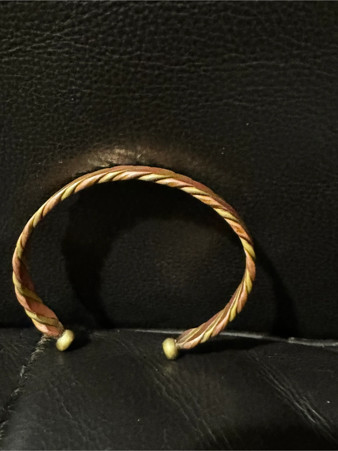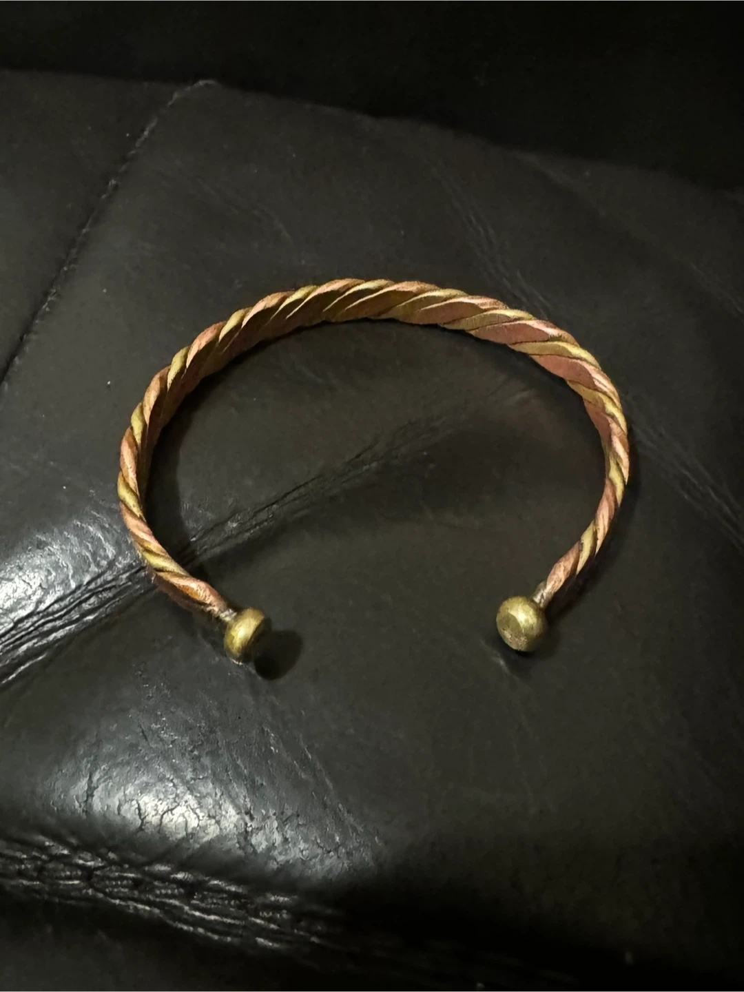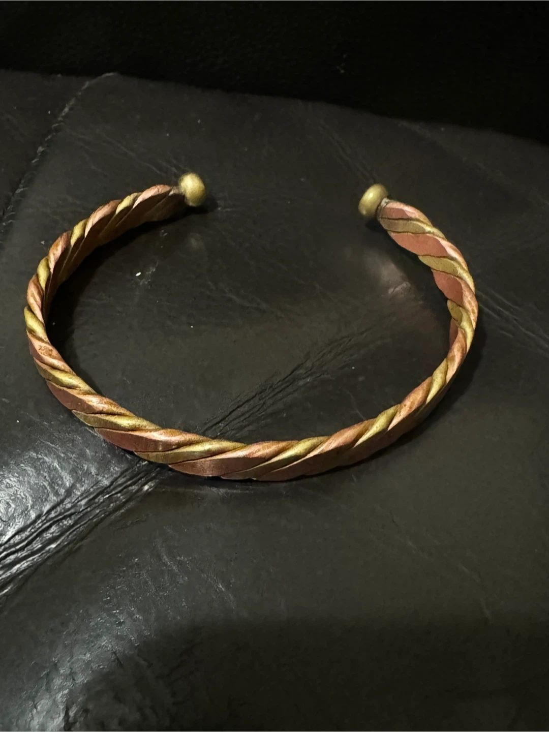15Here's a cool twisted bangle bracelet made of copper and brass! It's in good condition and ready for a new home. (Attention just make sure you aren’t allergic to copper) •*Health benefits of copper Aids in energy production Cellular metabolism: Copper is a component of enzymes, including cytochrome c oxidase, that are crucial for producing adenosine triphosphate (ATP), the body's main energy source. Reduced fatigue: By facilitating energy production, adequate copper levels help reduce tiredness and fatigue.