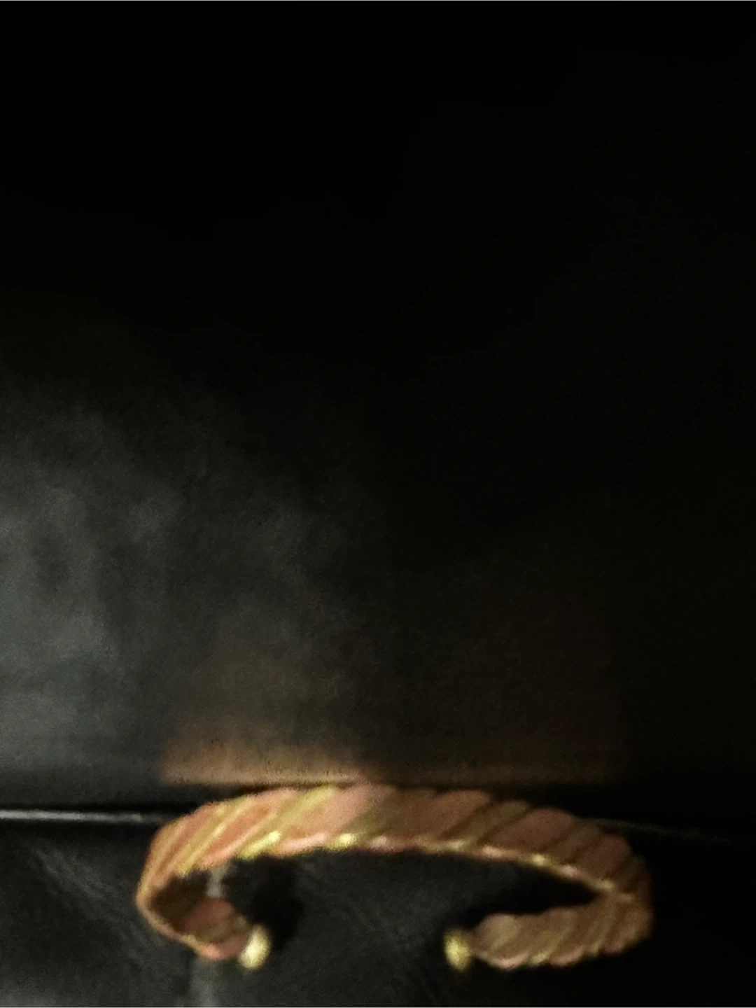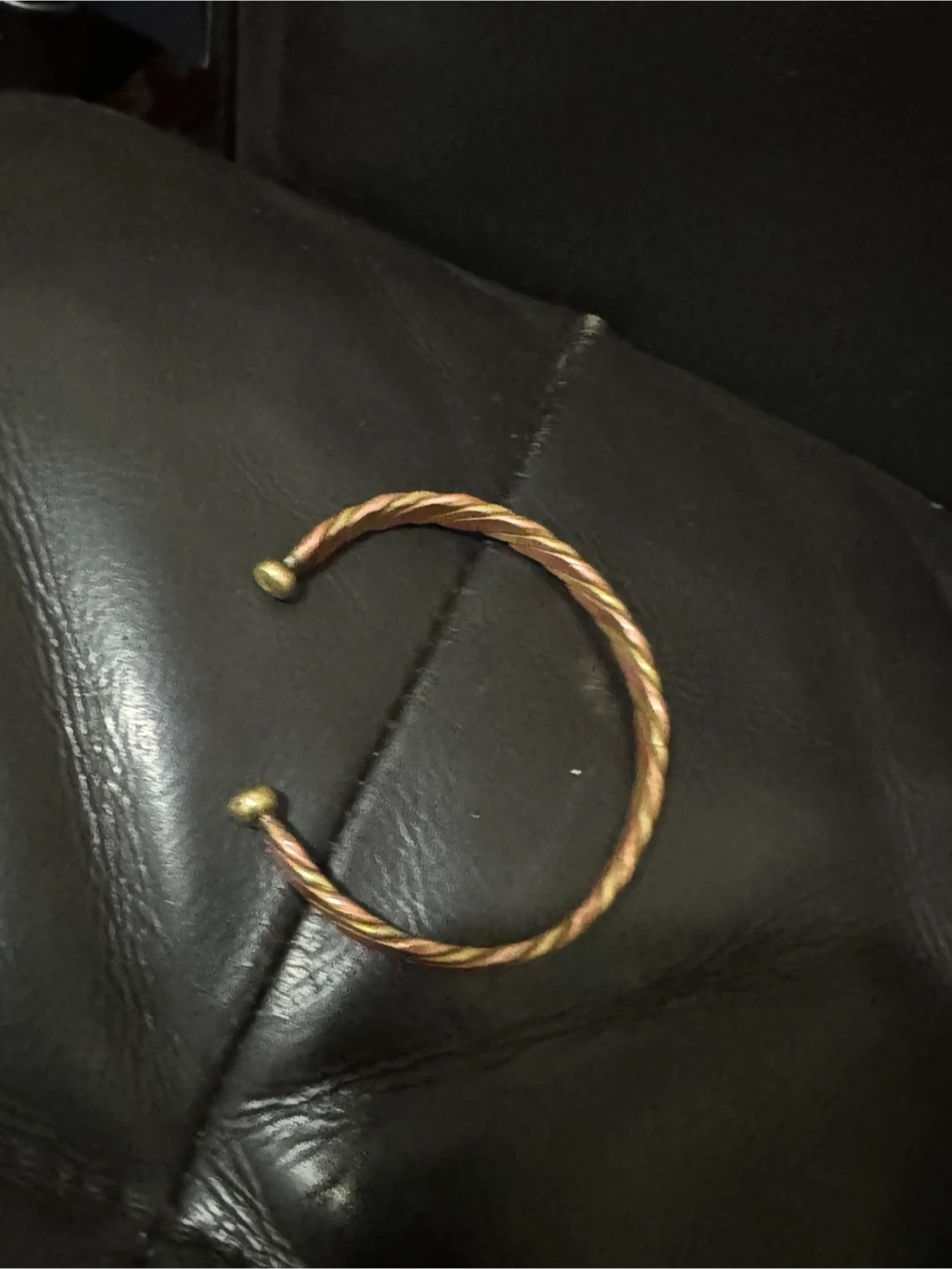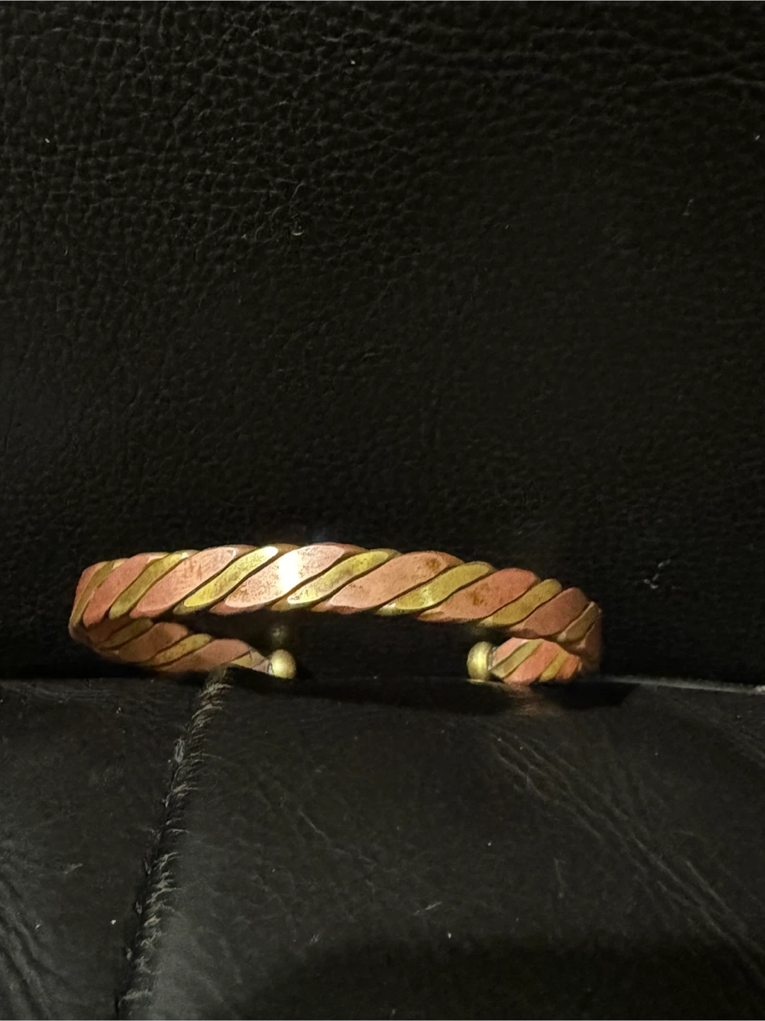 15Here's a cool twisted bangle bracelet made of copper and brass! It's in good condition and ready for a new home. (Attention just make sure you aren’t allergic to copper) •*Health benefits of copper Aids in energy production Cellular metabolism: Copper is a component of enzymes, including cytochrome c oxidase, that are crucial for producing adenosine triphosphate (ATP), the body's main energy source. Reduced fatigue: By facilitating energy production, adequate copper levels help reduce tiredness and fatigue.