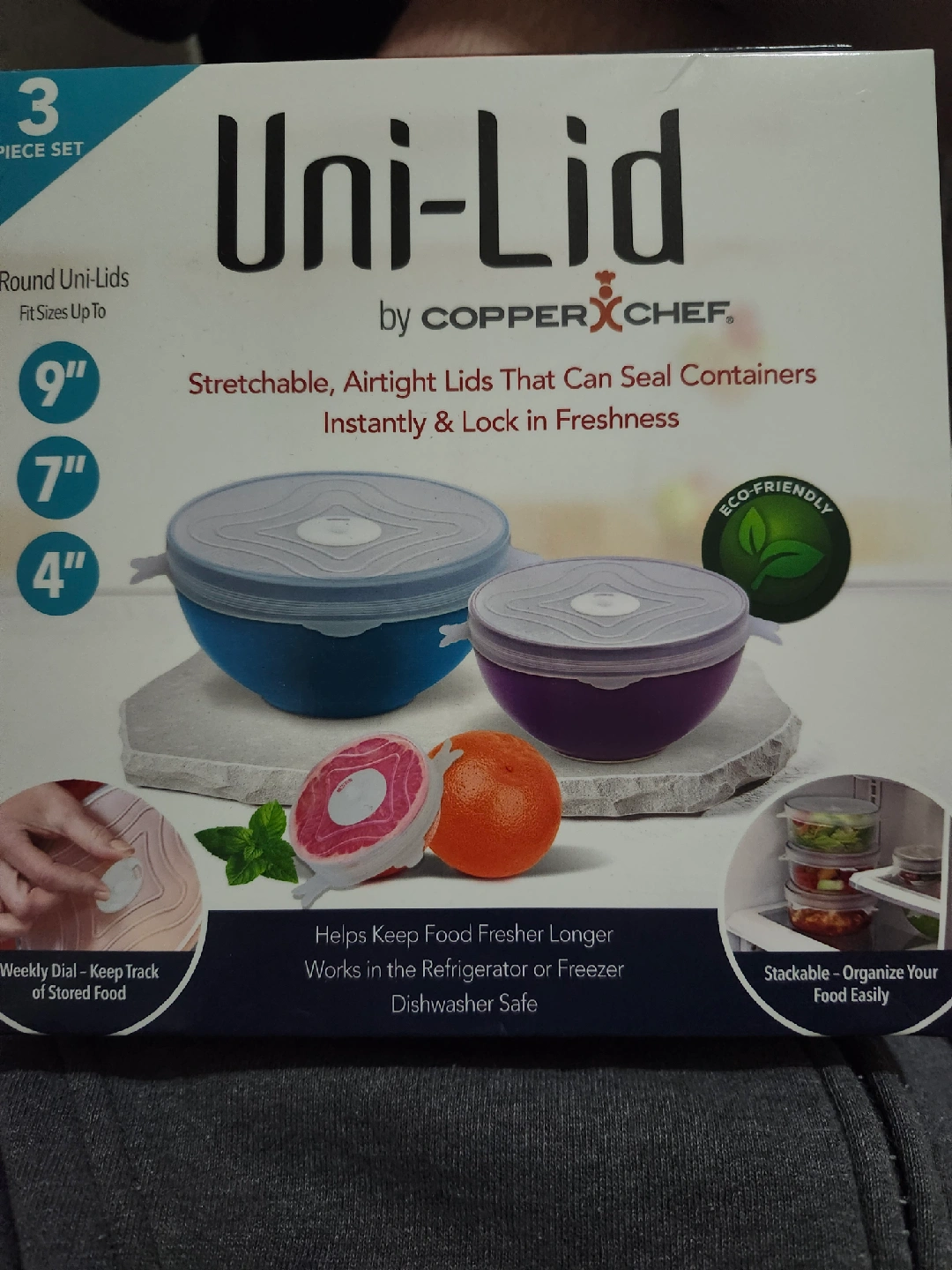 Selling a 3-piece set of Copper Chef Uni-Lids! These round, stretchable lids fit containers up to 9", 7", and 4" inches. They're designed to be airtight, sealing containers instantly to lock in freshness. They are also Eco-friendly and dishwasher safe! They help keep food fresher longer and can be stacked to help organize your food easily