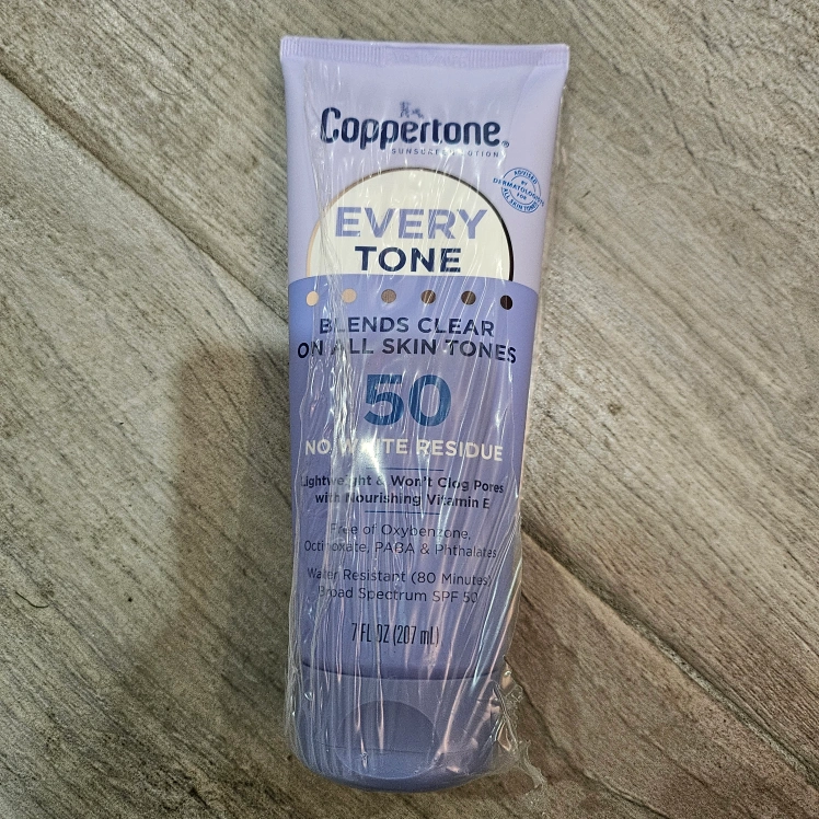 20Selling BRAND NEW UNOPENED Coppertone Every Tone sunscreen lotion with SPF 50. It blends clear on all skin tones and leaves no white residue. It's lightweight and won't clog pores, plus it has nourishing Vitamin E. It's also water-resistant for up to 80 minutes! The bottle contains 7 fl oz (207 mL).