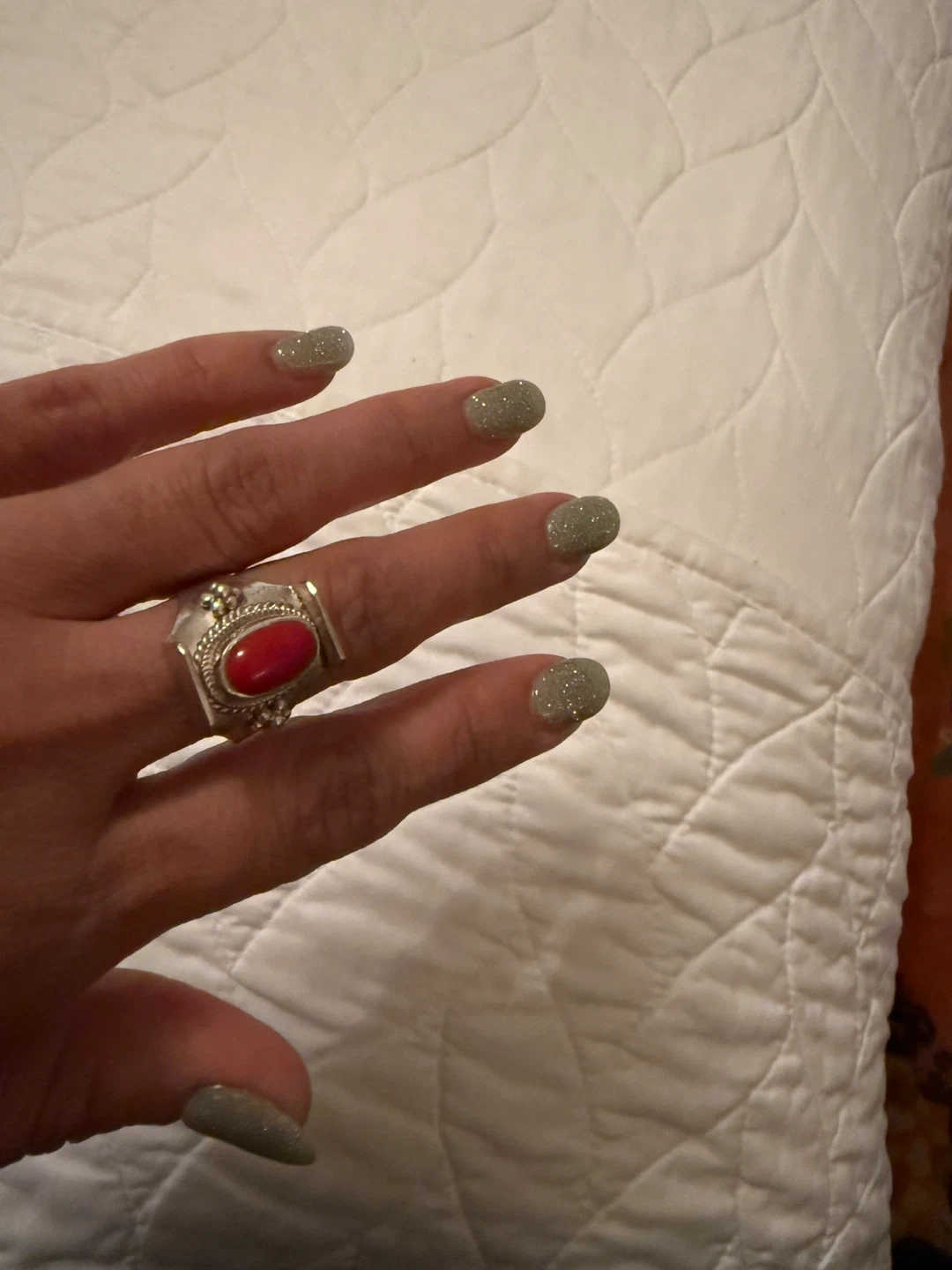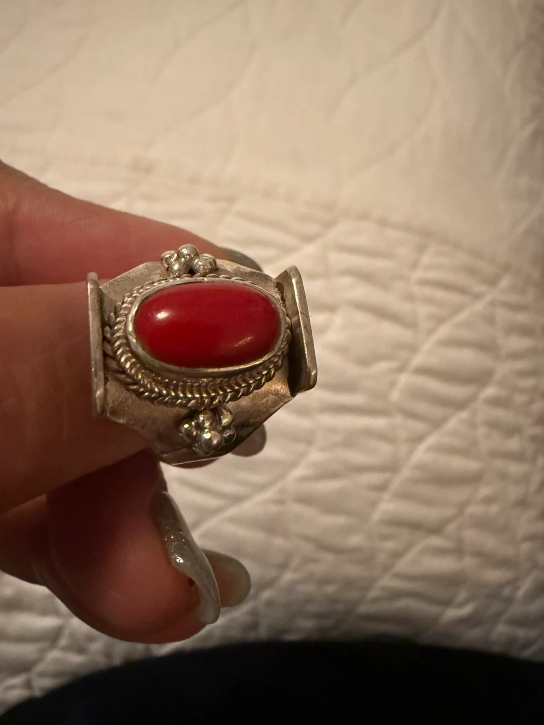 247Here's a ring with a coral stone. It's a unique piece that could add a pop of color to your jewelry collection! It's in good condition and ready for a new home