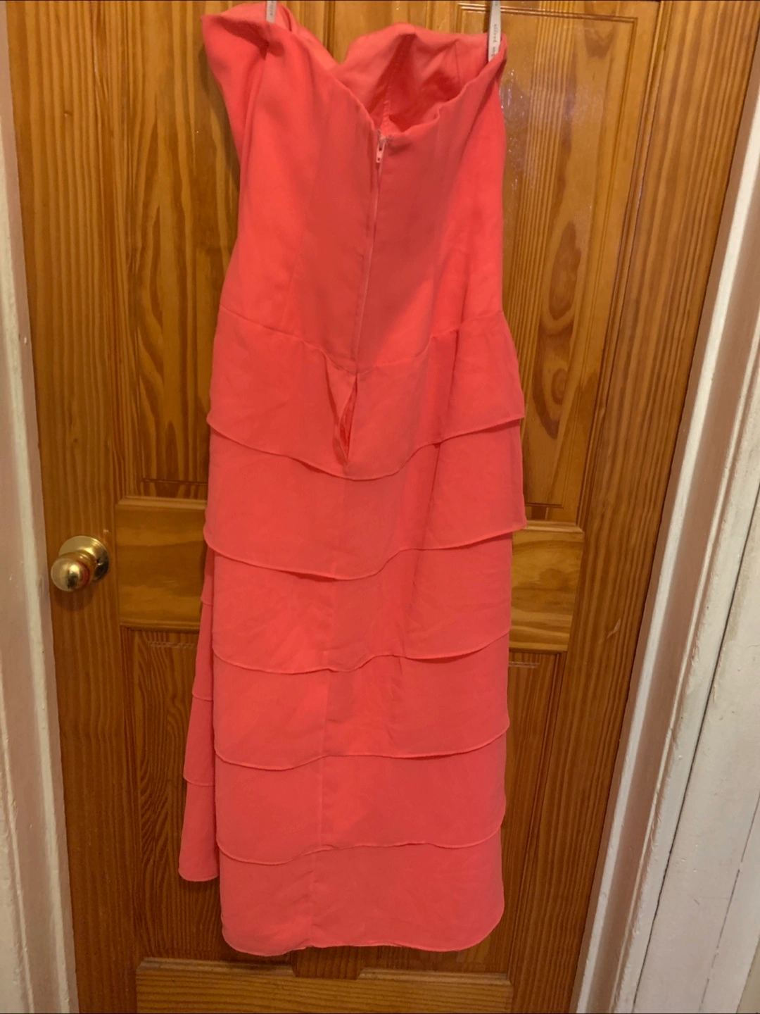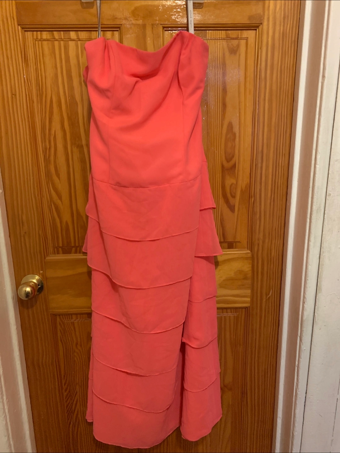 Selling a coral strapless dress with tiered layers. It's in great condition and ready for a great party day,