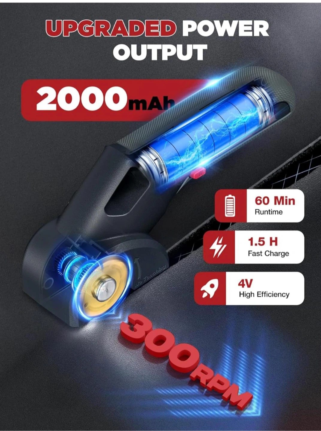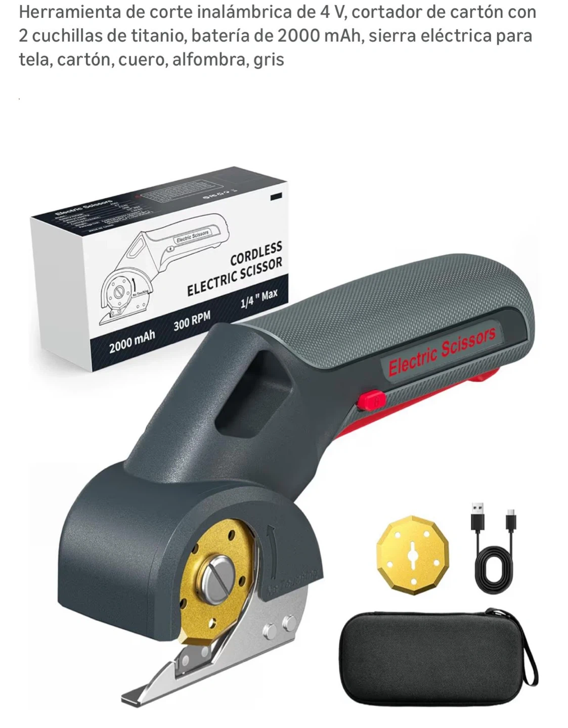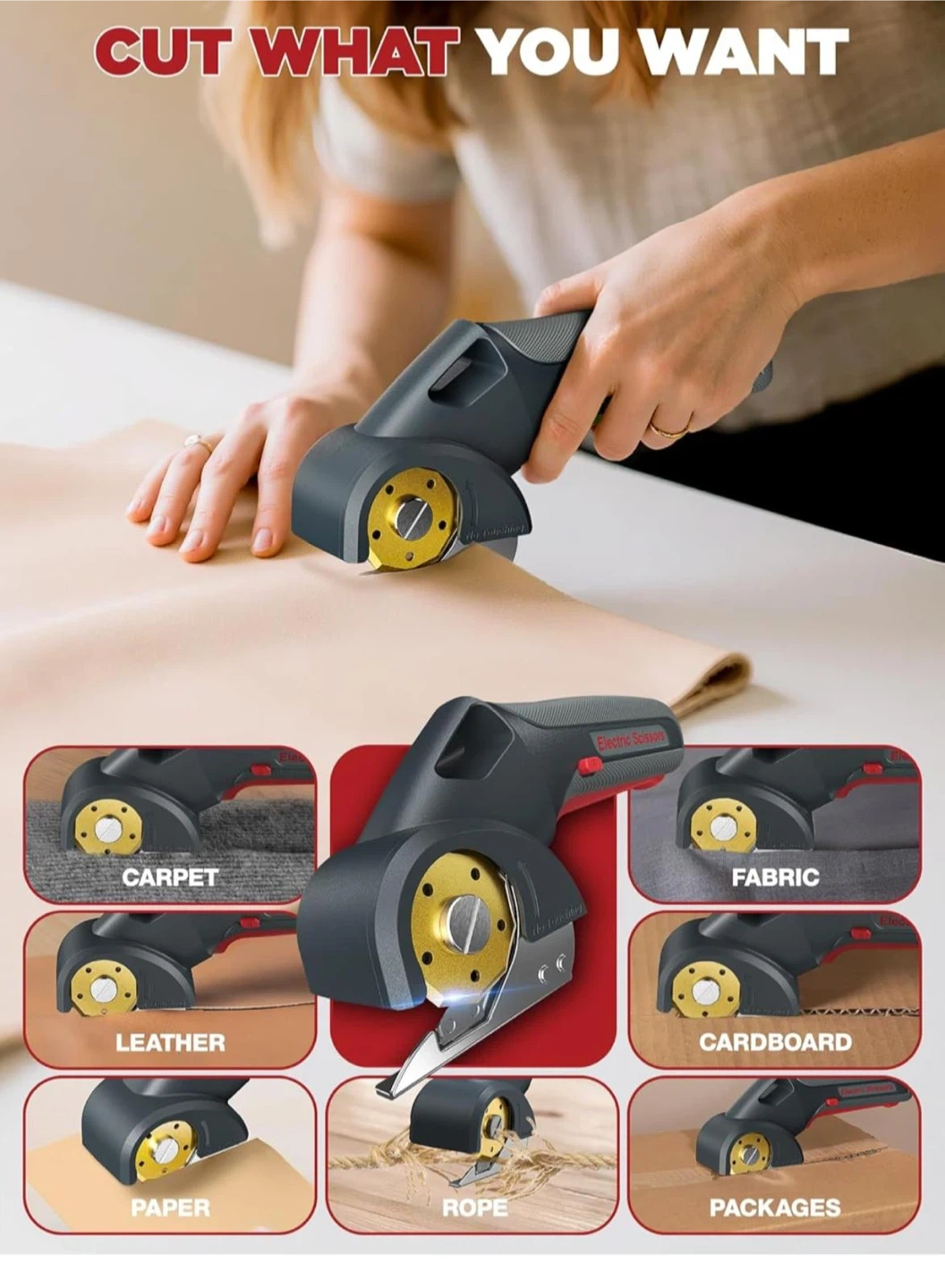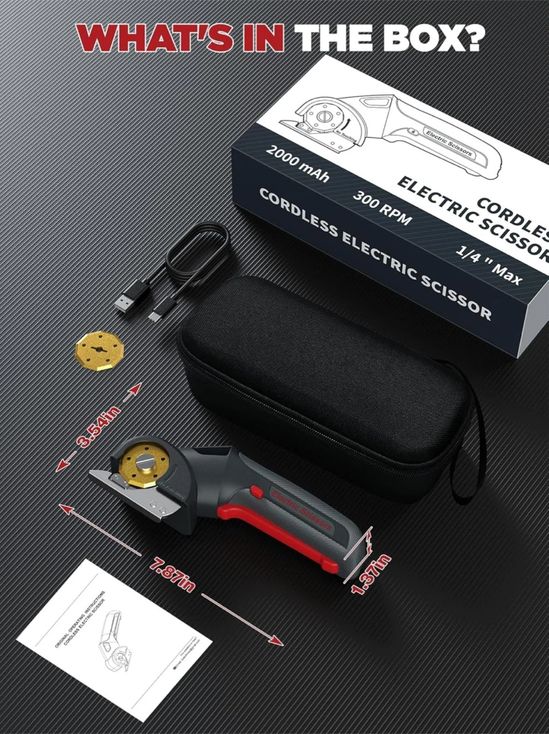 60I'm selling a Cordless Electric Scissor that can cut through a variety of materials like carpet, fabric, leather, cardboard, paper, rope and packages! It comes with a 2000 mAh battery and can reach 300 RPM. Included in the box are the electric scissors, charger, and carrying case