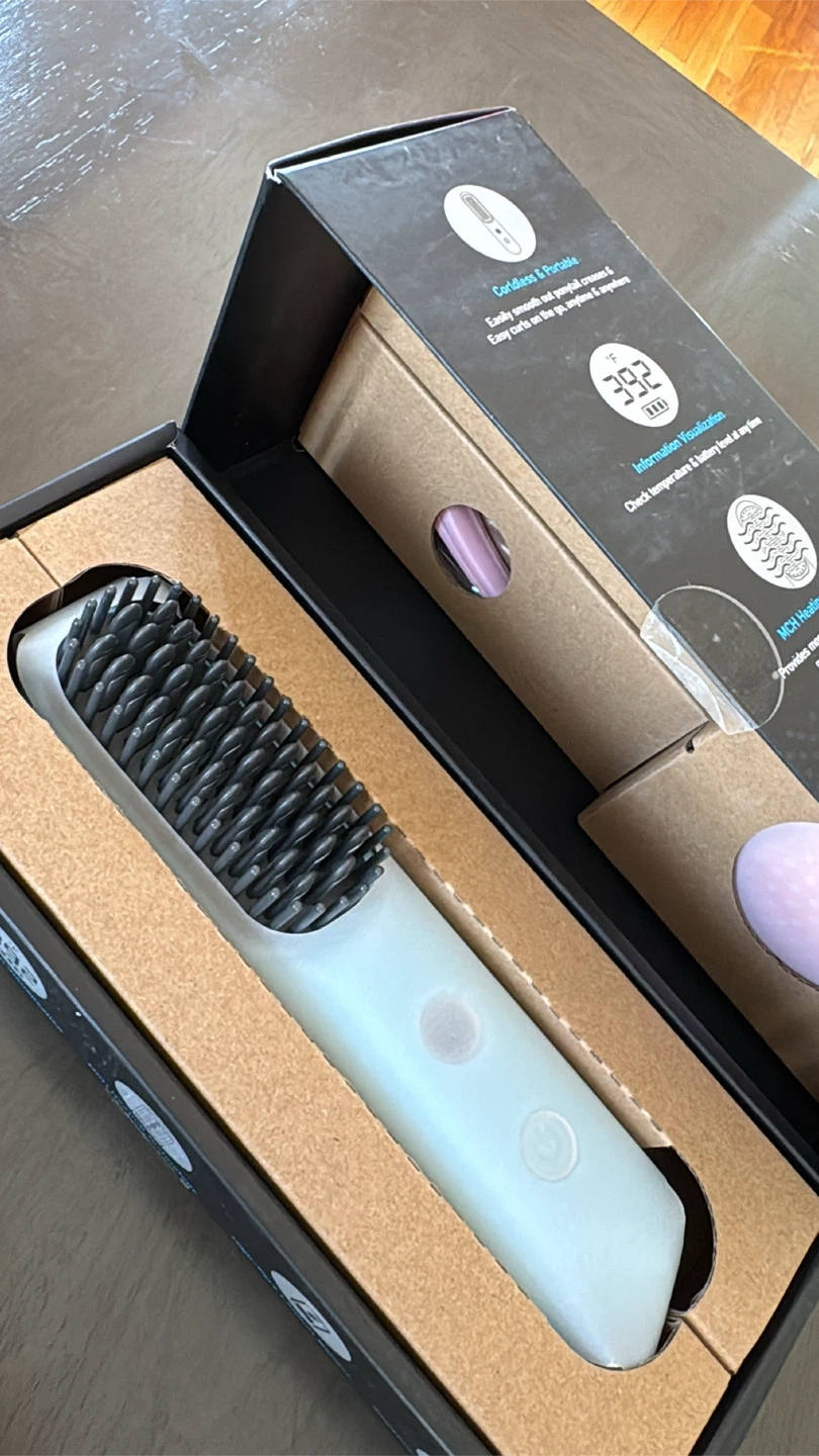I'm selling a cordless and portable hair straightening brush. It's designed to easily smooth out ponytail creases and create easy curls on the go. The brush also features information visualization to check the temperature and battery level at any time