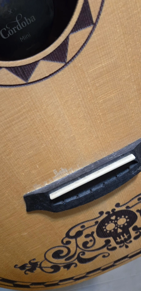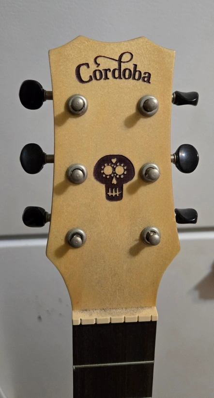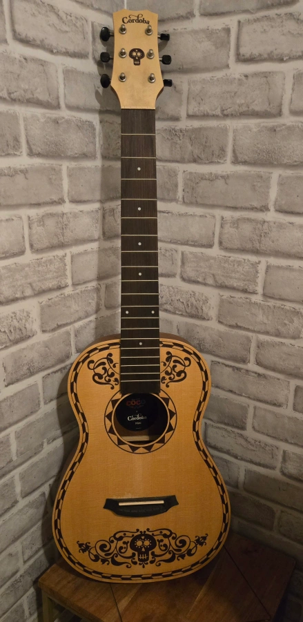 Mini Cordoba acoustic guitar. Disney Pixar Coco design. Unique skull details on headstock and body. Minor damage to front, no strings or case. specs: https://cordobaguitars.com/product/coco-mini-spmh/ pickup only