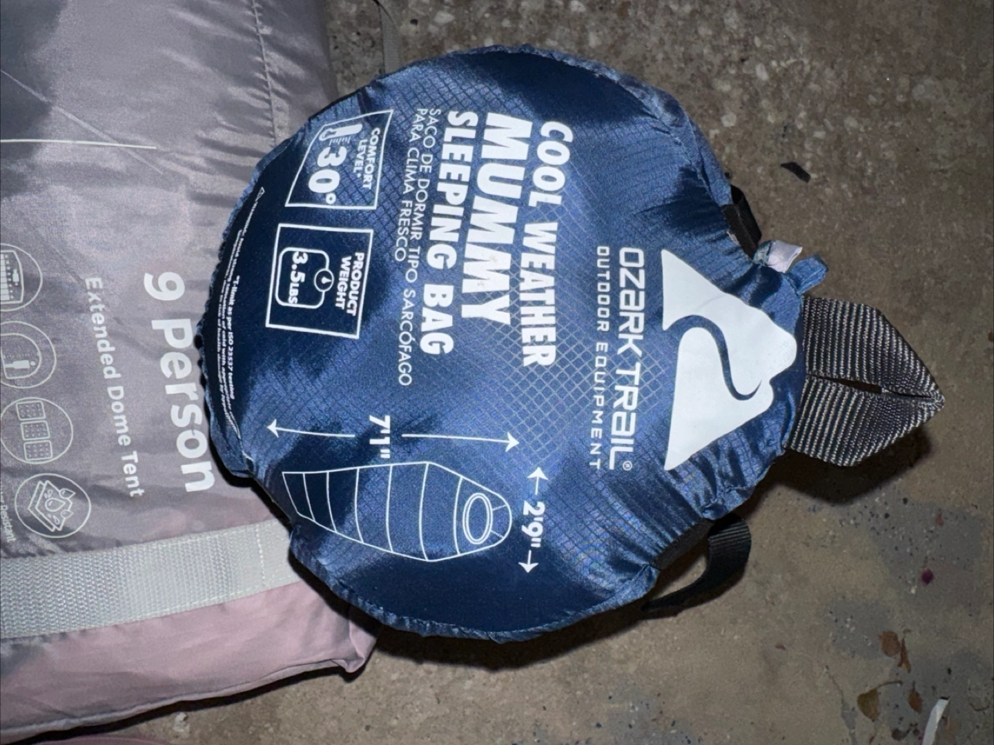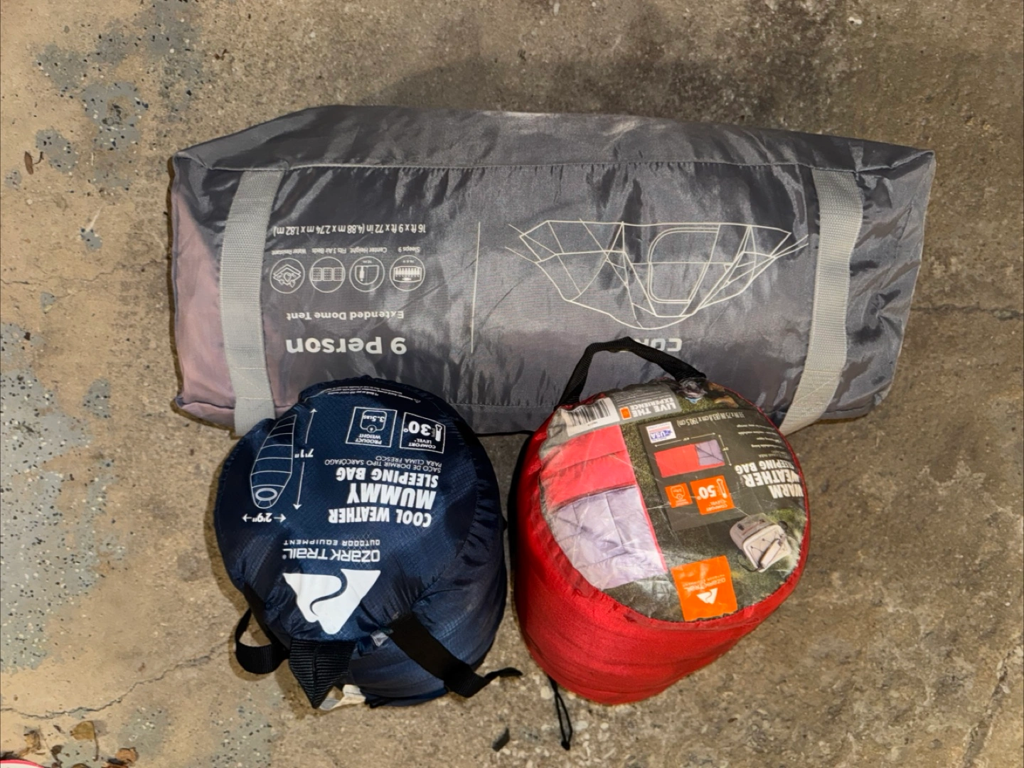 Selling a Core 9 Person Extended Dome Tent along with two sleeping bags! One is an Ozark Trail Cool Weather Mummy Sleeping Bag, comfort level 30 degrees. The other is a Warm Weather Sleeping Bag, comfort level 50 degrees. Perfect for camping!