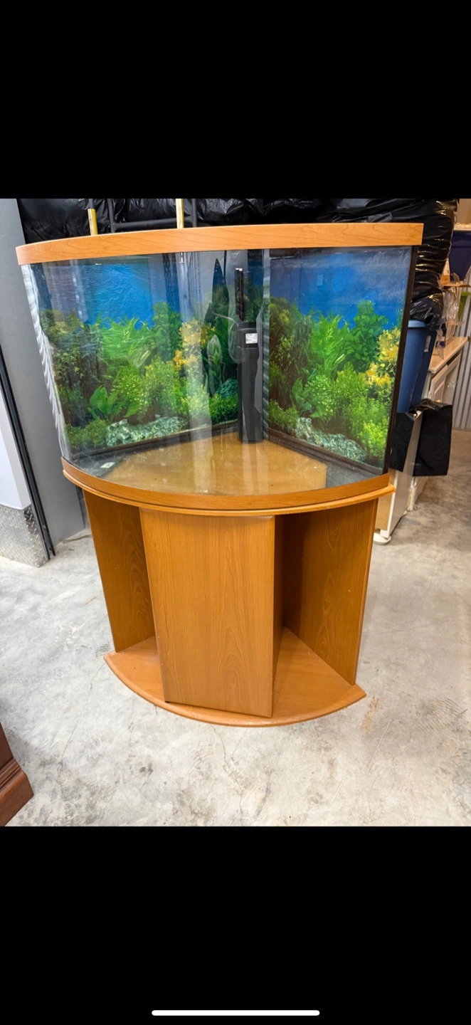 Selling a corner fish tank with a wooden stand. It's in good condition and ready for a new home for your aquatic friends
