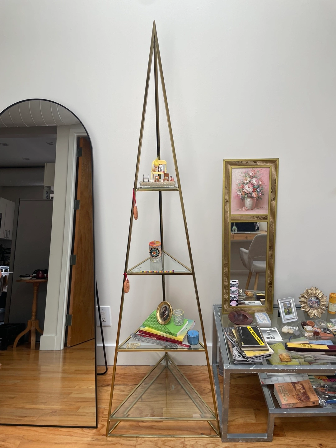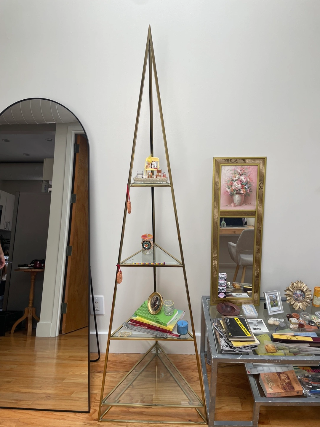 24Selling a stylish corner shelf with a gold-tone metal frame and glass shelves. It's perfect for displaying your favorite items and adding a touch of elegance to any room. The shelf is in great condition and ready for a new home!