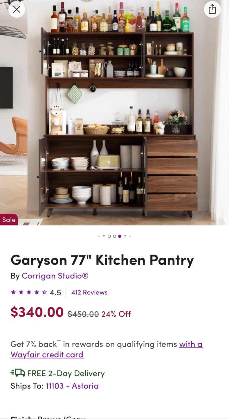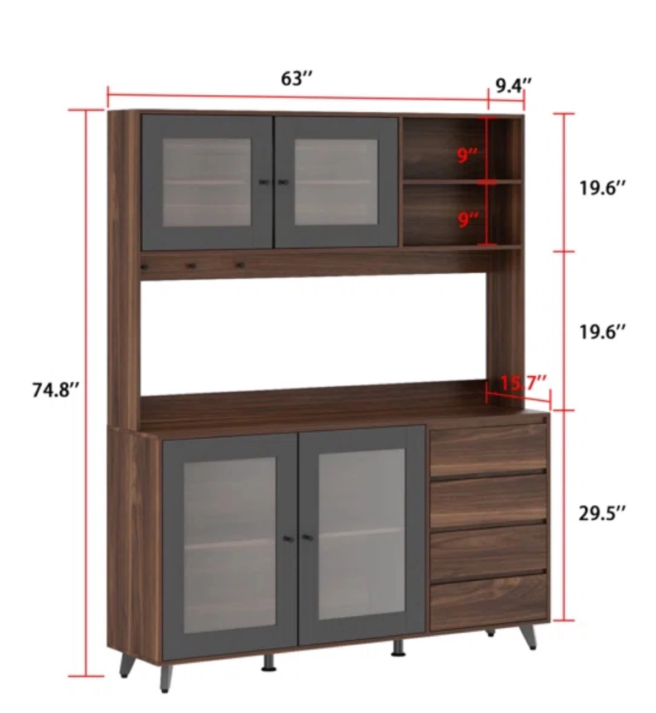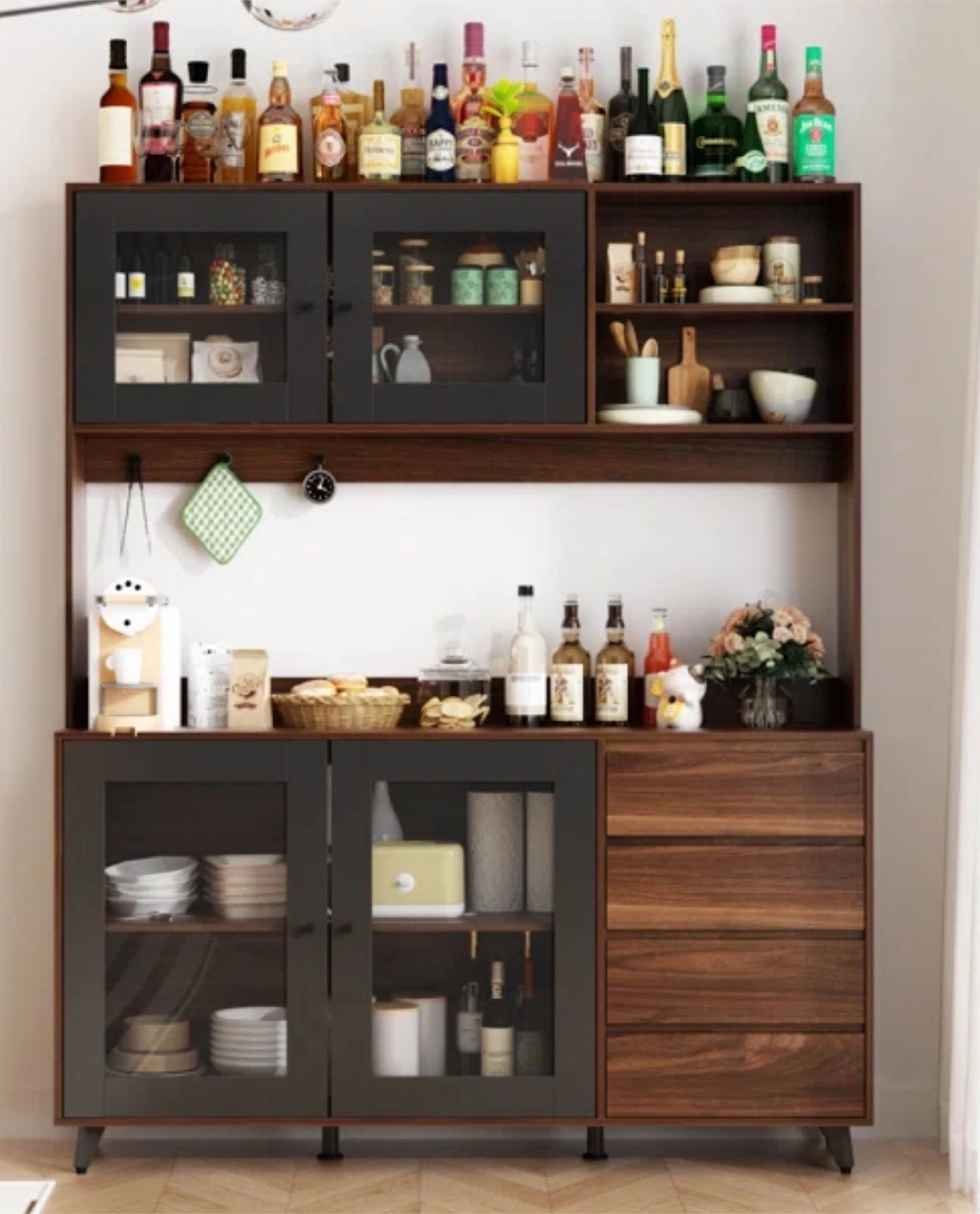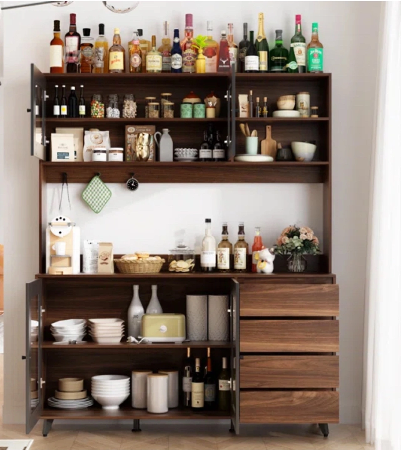 35Large kitchen pantry. Brown wood finish. Glass doors. Multiple shelves and drawers. Stylish design. Great for storage.