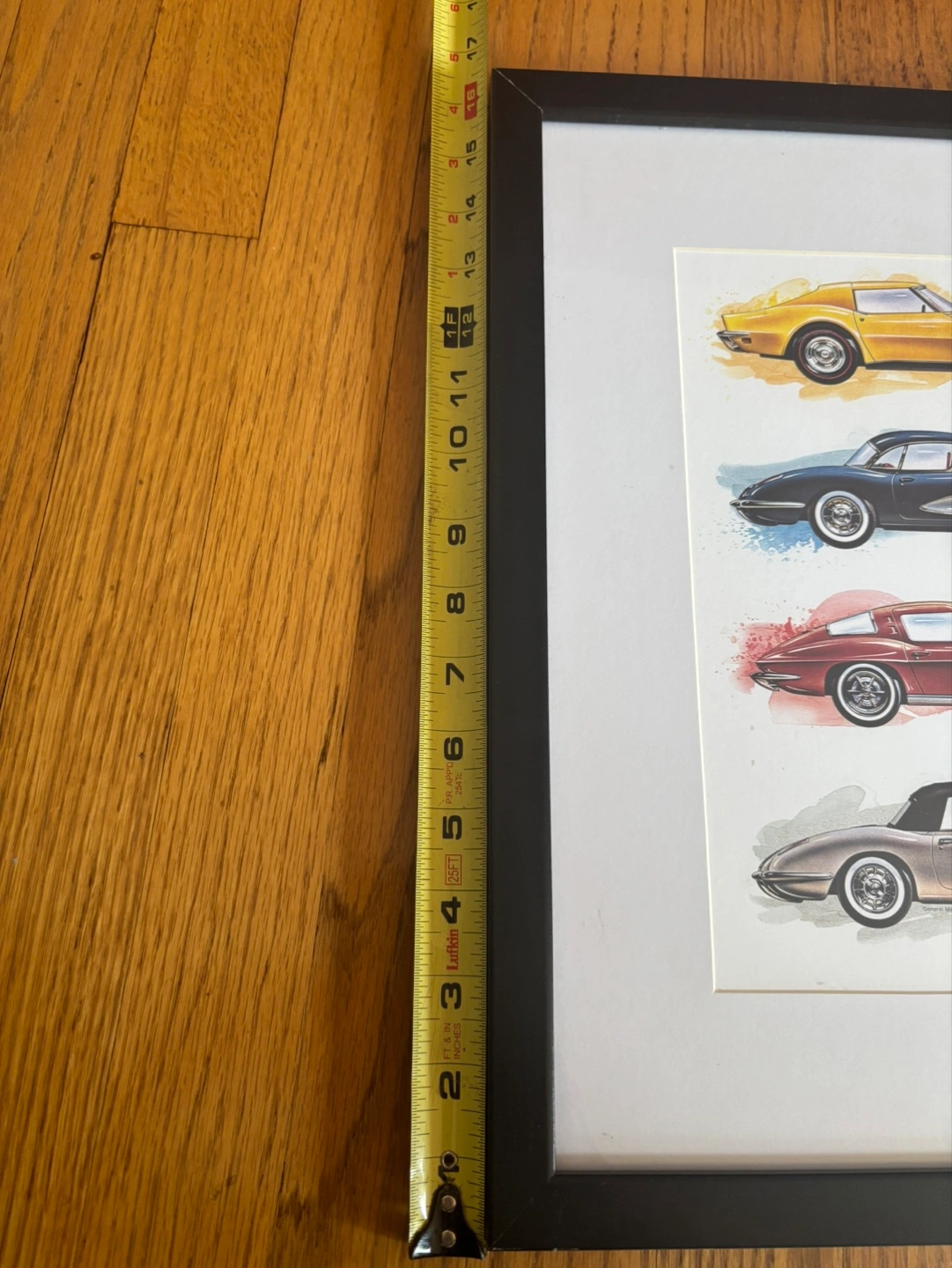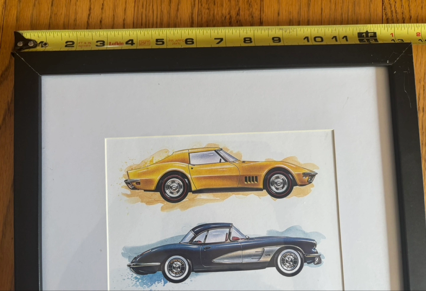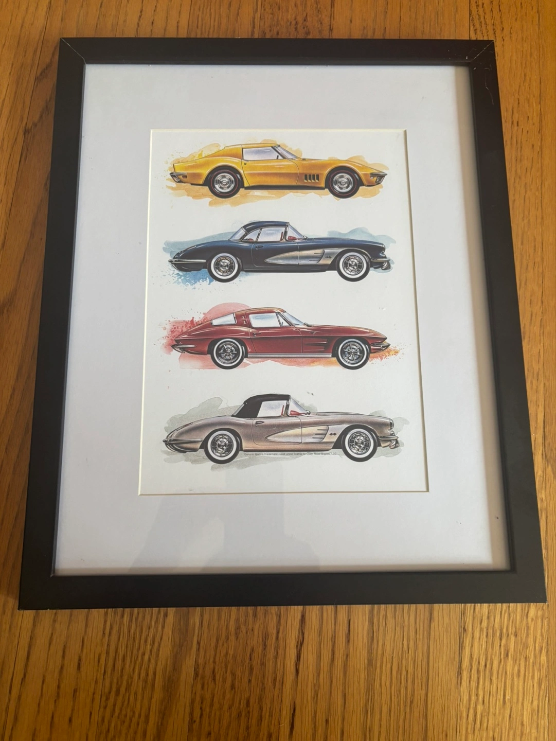 Framed art featuring classic Corvettes! The frame measures approximately 13 x 16 inches. The back includes an Open Road Brands logo. The frame does have some scratches on it but overall in good condition.